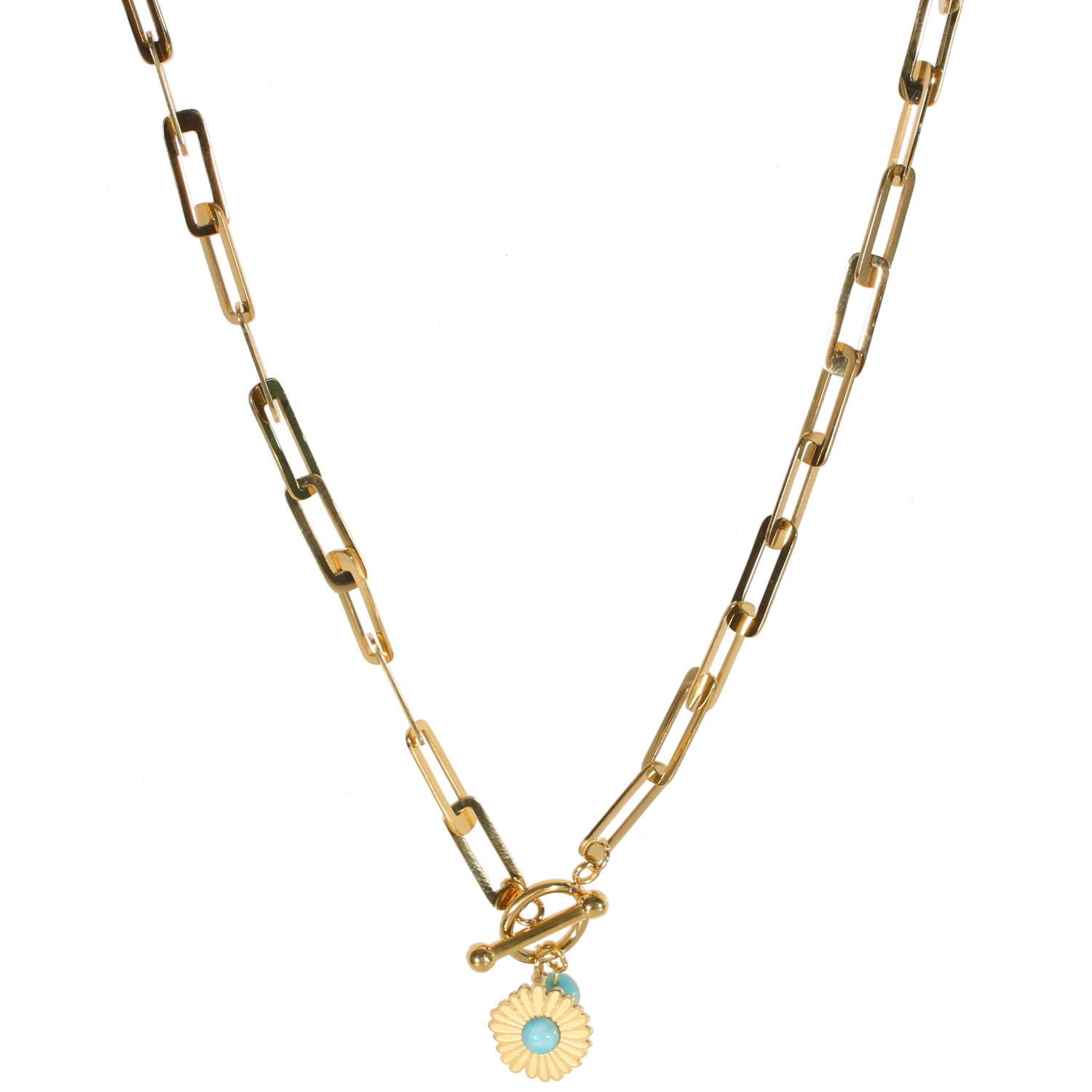 Collier avec fermoir cabillaud en acier doré avec pendentifs composés d'une véritable pierre d'amazonite et d'une fleur marguerite en acier doré surmontée d'une véritable pierre d'amazonite.