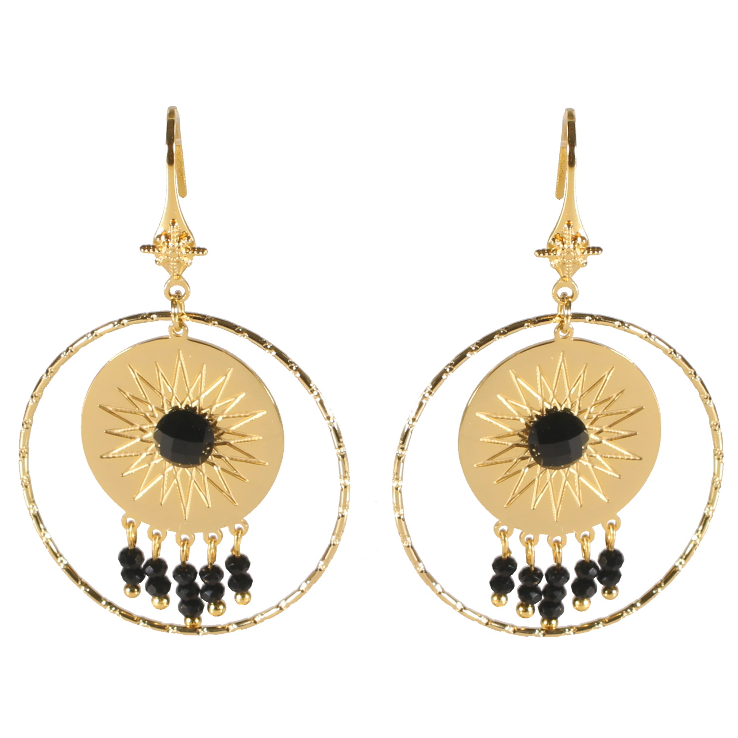 Description Boucles d'oreilles pendantes composées d'une étoile et d'un cercle en acier doré, d'une pastille ronde représentant un soleil en acier doré surmontée d'une pierre de couleur noire, et des pampilles de perles de couleur noire. Largeur 34 mm Hauteur 53 mm Matière(s) Acier , Rocaille . L'acier utilisé dans la bijouterie existe sous plusieurs qualités. Nous utilisons principalement la qualité 316L, qualité qui est utilisée en chirurgie. Cet acier est donc inoxydable et reste très résistant. Fermoir Crochets Couleur(s) dominante(s) Doré , Noir Public Adolescent , Adulte . Genre Femme , Fille . Saison Indémodable . Thème(s) Nature . Cliquez sur une matière, un thème, une couleur ou une collection pour voir tous les articles associés.