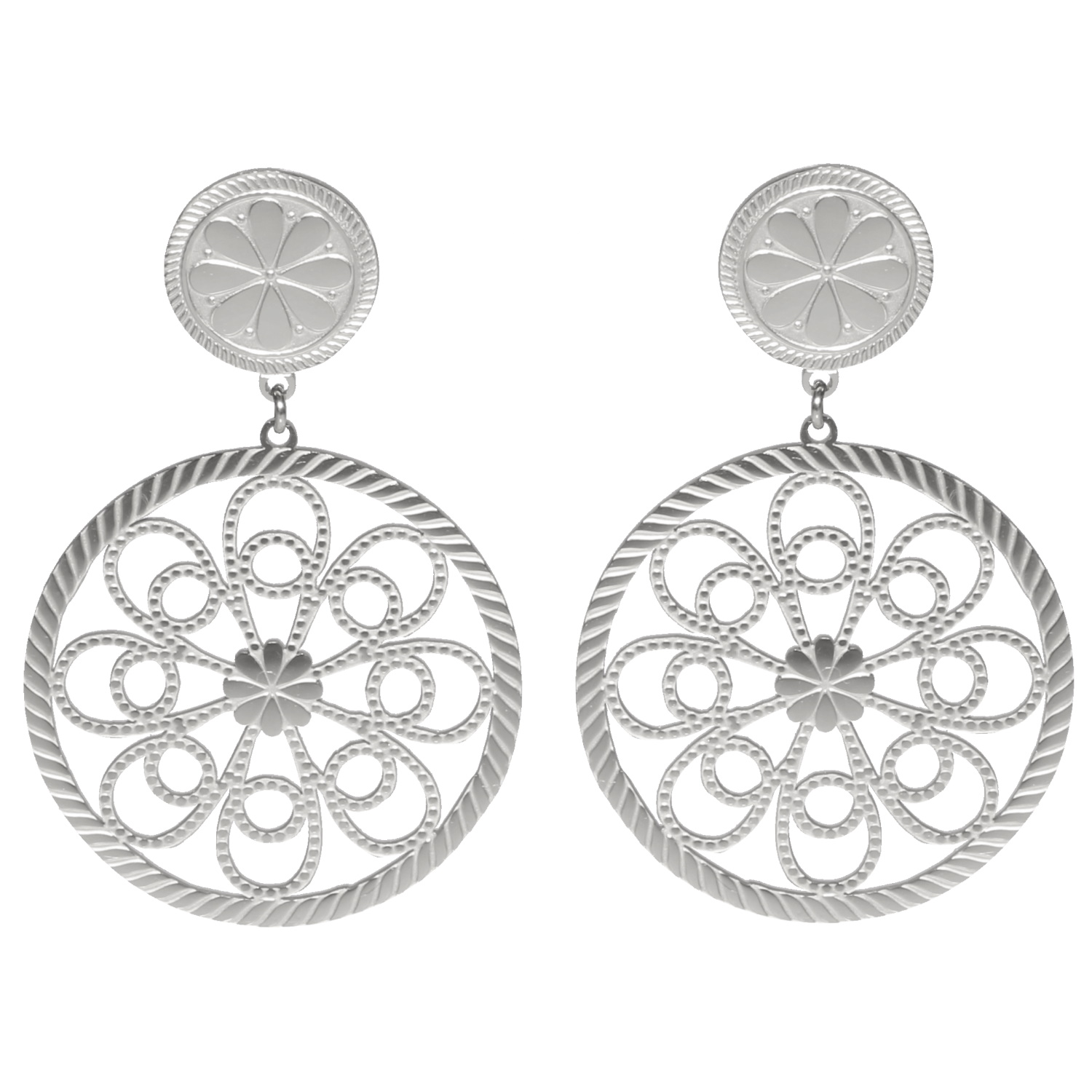 Description Boucles d'oreilles pendantes composées d'une pastille ronde avec motifs et d'une pastille ronde avec motifs filigranes en acier argenté. Largeur 35 mm Hauteur 55 mm Matière(s) Acier . L'acier utilisé dans la bijouterie existe sous plusieurs qualités. Nous utilisons principalement la qualité 316L, qualité qui est utilisée en chirurgie. Cet acier est donc inoxydable et reste très résistant. Fermoir Tiges poussettes Couleur(s) dominante(s) Argenté Public Adolescent , Adulte . Genre Femme , Fille . Saison Indémodable . Cliquez sur une matière, un thème, une couleur ou une collection pour voir tous les articles associés.