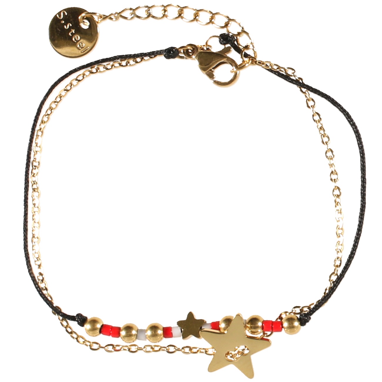 Bracelet deux tours avec étoiles en acier doré, cordon en coton et perles de couleurs.