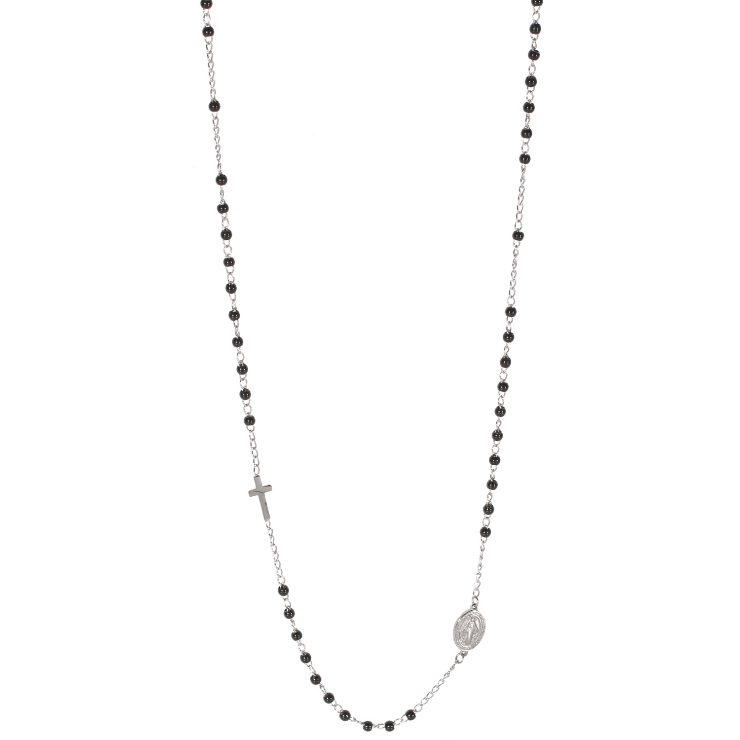 Collier avec croix et vierge en acier argenté et perles de couleur.