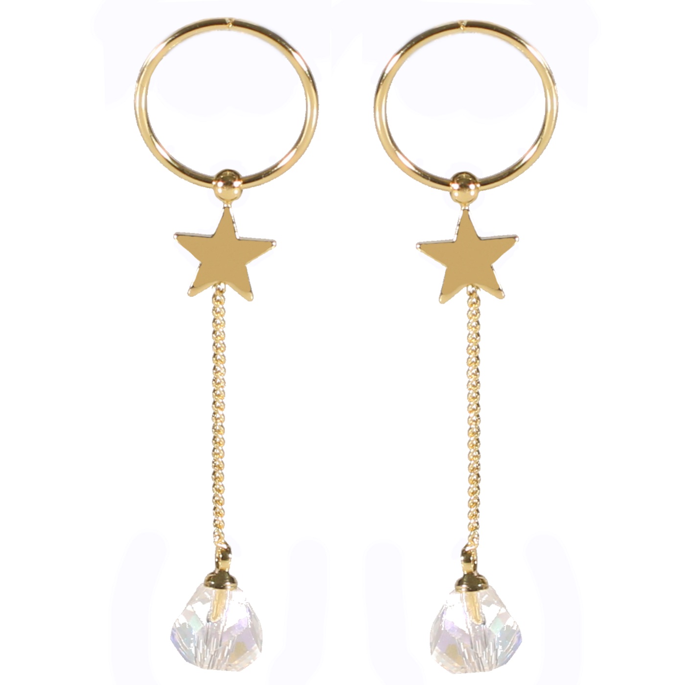 Boucles d'oreilles pendantes étoile et cercle en métal doré et cristal en verre.