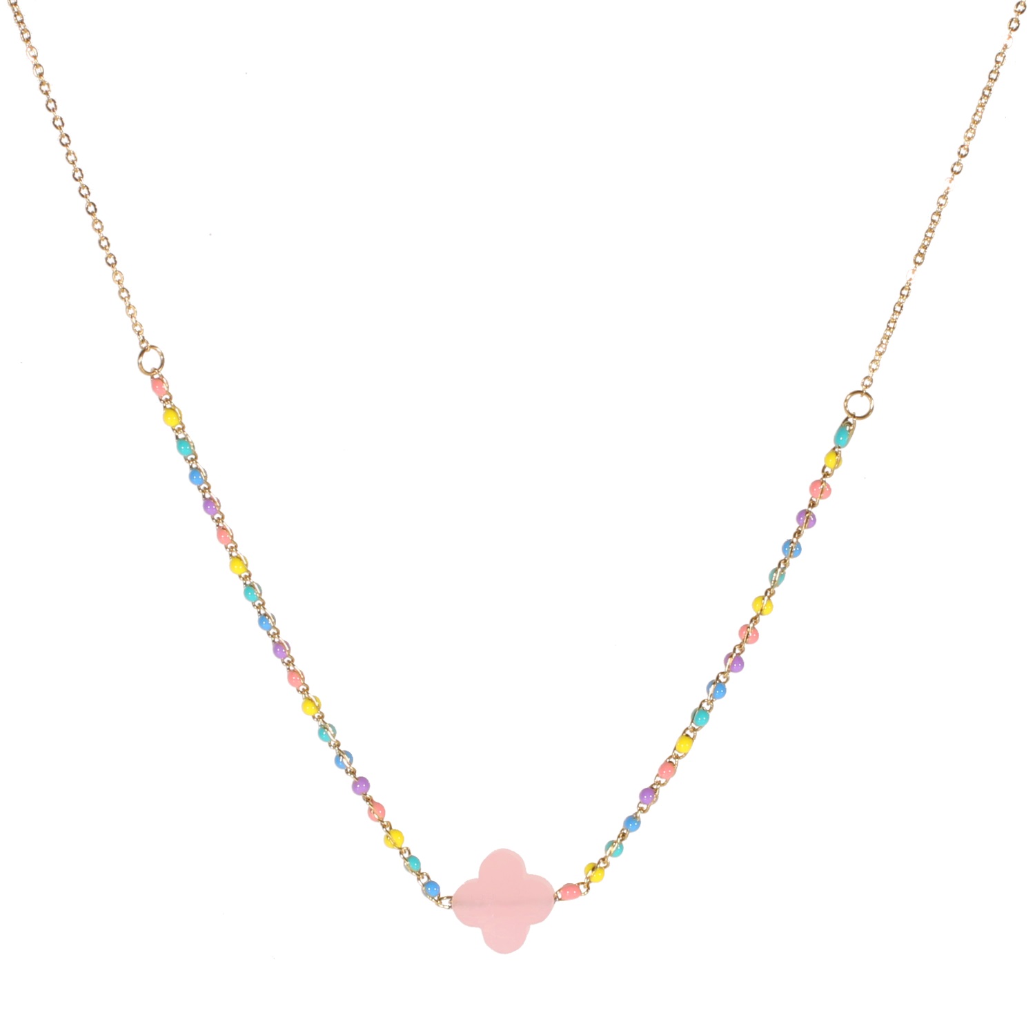 Collier en acier doré, perles en émail et pendentif croix en pierre de couleur.