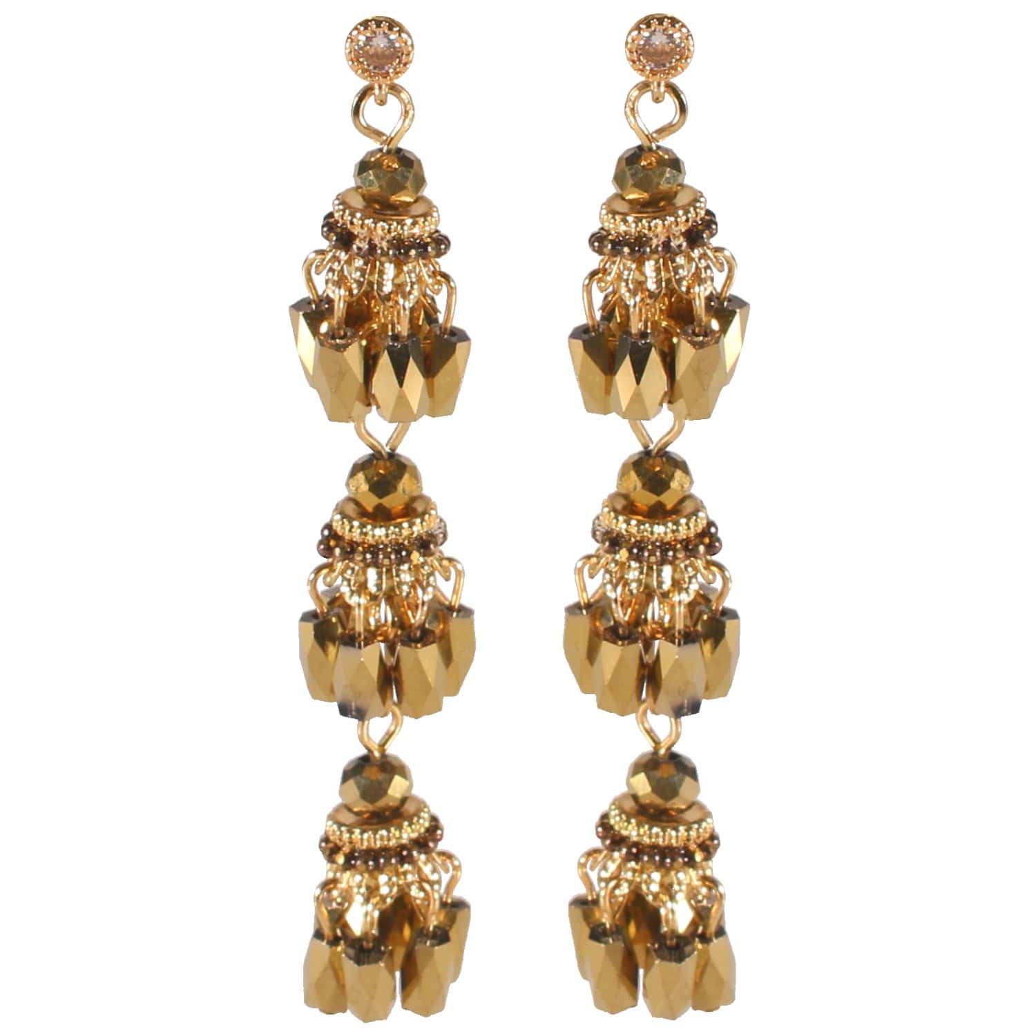 Boucles d'oreilles pendantes fantaisie en métal doré, métal peint et cristaux en verre.