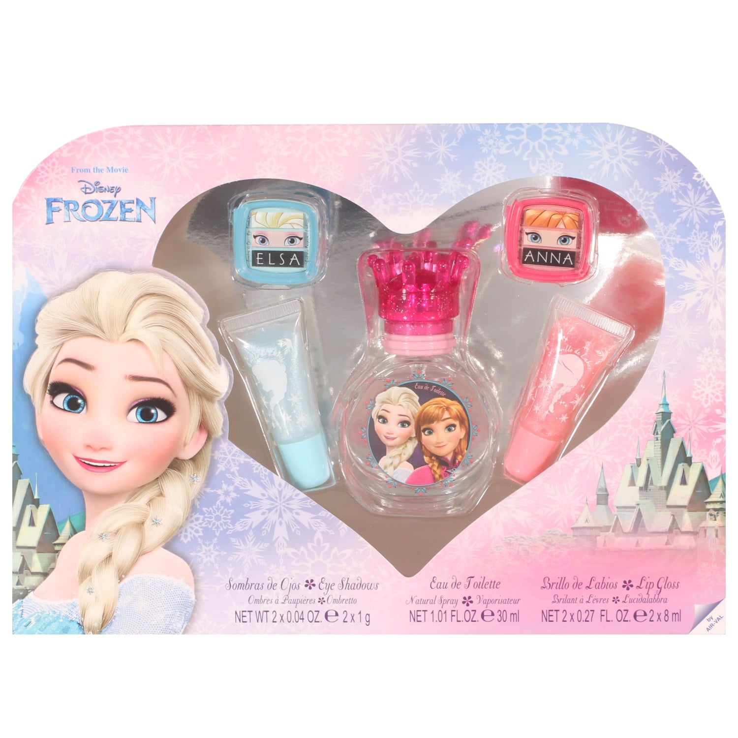 Eau de toilette Reine des neiges de Disney avec personnage de Elsa et Anna ainsi que deux ombres à paupières et deux brillants à lèvres.