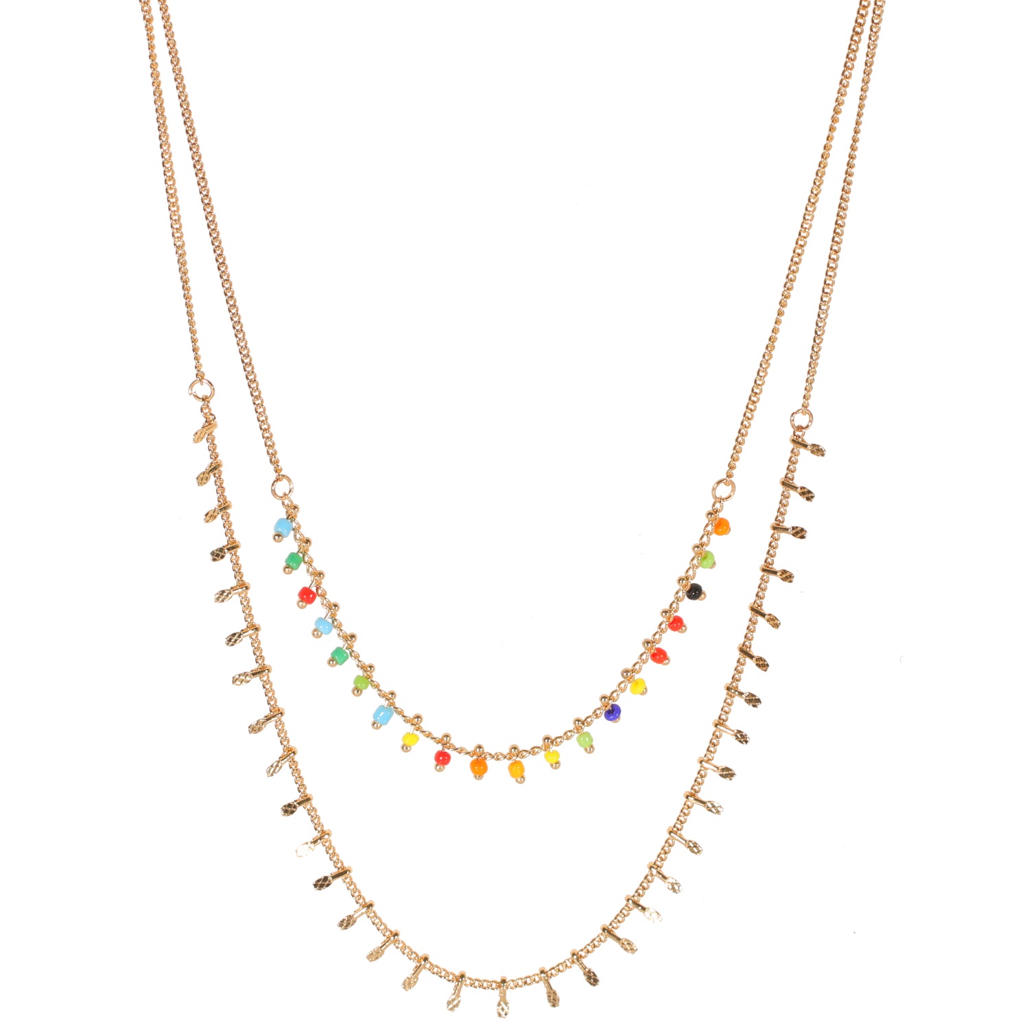 Collier double rang composé d'un collier de 39 cm de long en métal doré et perles pendantes en émail de couleur ainsi qu'un collier de 45 cm de long avec pampilles en métal doré.
