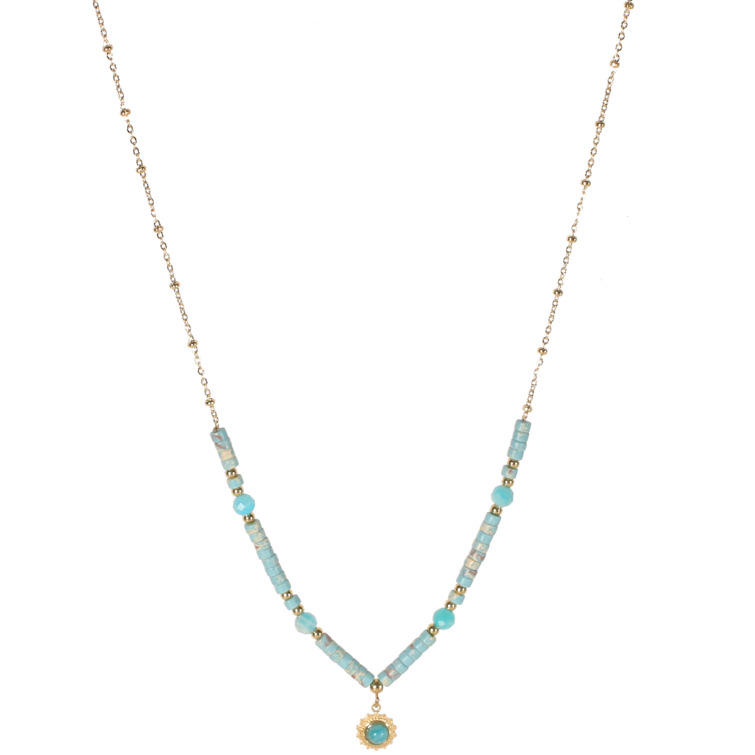 Collier composé d'une chaîne en acier doré, perles en pierre naturelle et pendant soleil en acier doré surmonté d'une véritable pierre d'amazonite.