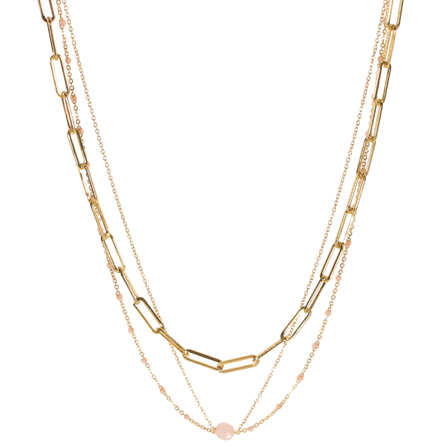 Collier triple rangs composé d'une chaîne de 37 cm de long, une chaîne de 38 cm de long avec perles en émail de couleur rose, ainsi qu'un collier de 40 cm de long avec une perle en véritable pierre de quartz rose.