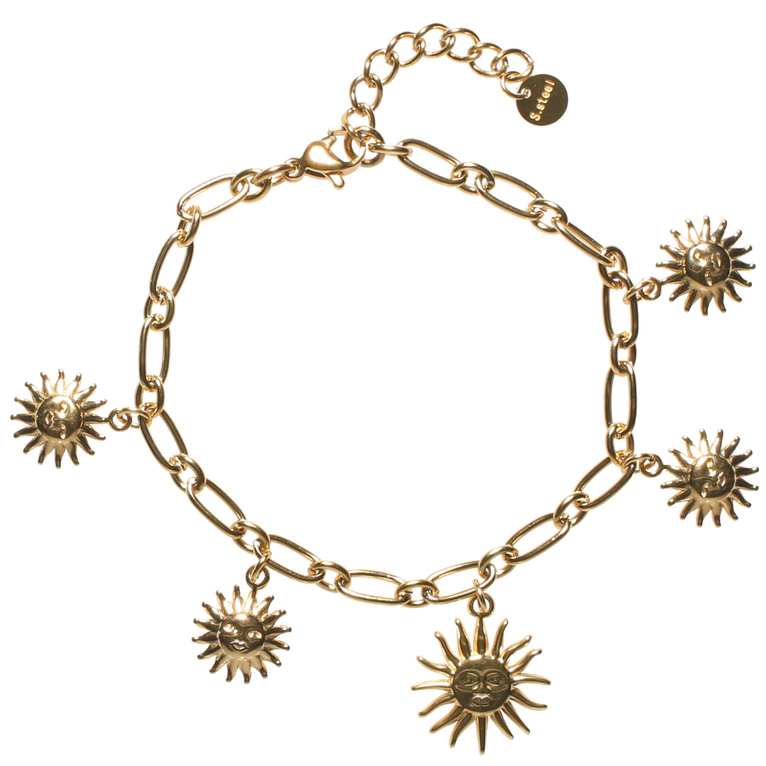 Description Bracelet composé d'une chaîne et de breloques soleils avec visage en acier doré. Fermoir mousqueton avec 3 cm de rallonge. Longueur 16+3 cm [Guide des tailles] Largeur 20 mm Matière(s) Acier . L'acier utilisé dans la bijouterie existe sous plusieurs qualités. Nous utilisons principalement la qualité 316L, qualité qui est utilisée en chirurgie. Cet acier est donc inoxydable et reste très résistant. Fermoir Mousqueton Couleur(s) dominante(s) Doré Public Adolescent , Adulte . Genre Femme , Fille . Saison Indémodable . Thème(s) Nature . Cliquez sur une matière, un thème, une couleur ou une collection pour voir tous les articles associés.