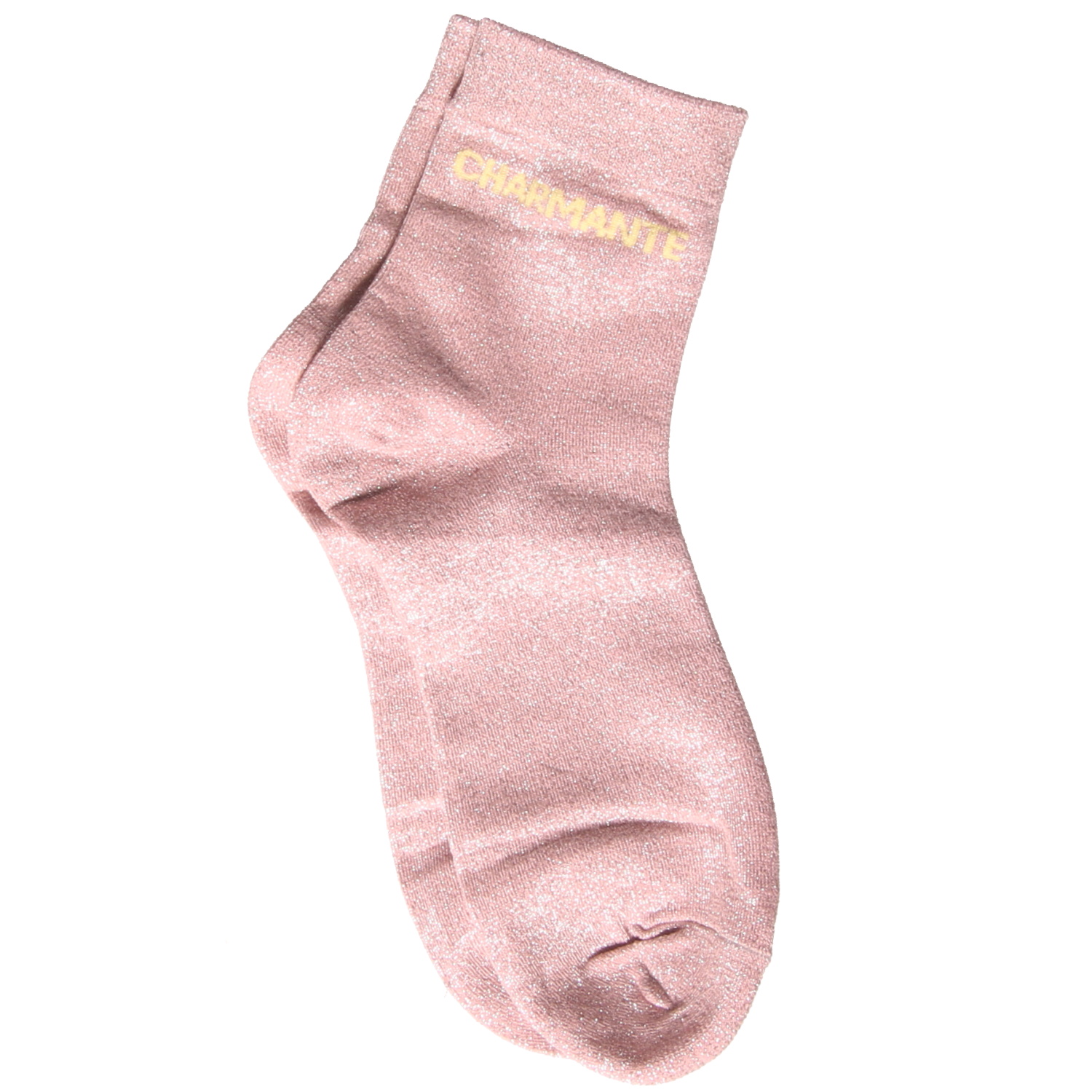 Description Ces chaussettes arborent un style à la fois féminin et scintillant. Elles sont d’un coloris rose poudré (ou vieux rose) avec une finition irisante grâce à l'intégration de fils métallisés (type Lurex), ce qui leur donne un aspect brillant et festif. On peut lire l'inscription CHARMANTE tricotée en lettres capitales de couleur jaune pâle/dorée au niveau de la cheville. 70% Polyester 30% Elasthanne.