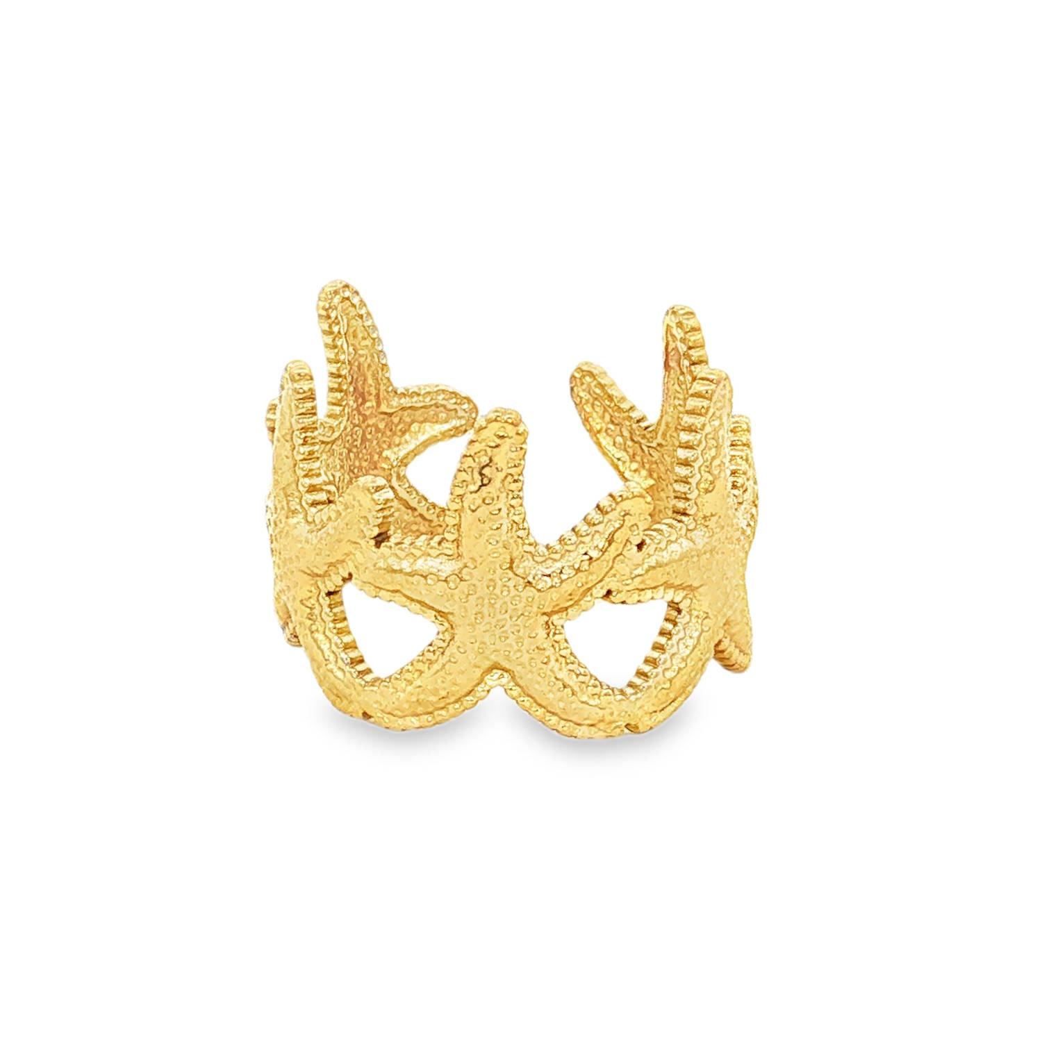 Description Cette bague majestueuse est une véritable ode à la beauté mystérieuse de l'océan. Conçue pour celles et ceux qui cherchent une pièce forte, elle capture l'essence même de la vie marine à travers un design organique et audacieux. La bague se distingue par sa structure ajourée et sculpturale, composée d'une farandole d'étoiles de mer qui s'entrelacent pour former l'anneau. Sa structure ajustable permet de l'adapter facilement à toutes les morphologies de doigts. Largeur 15 mm Matière(s) Acier . L'acier utilisé dans la bijouterie existe sous plusieurs qualités. Nous utilisons principalement la qualité 316L, qualité qui est utilisée en chirurgie. Cet acier est donc inoxydable et reste très résistant. Fermoir Aucun Couleur(s) dominante(s) Doré Public Adolescent , Adulte . Genre Femme , Fille . Saison Indémodable . Thème(s) Animaux , Nature . Collection Seaside Cliquez sur une matière, un thème, une couleur ou une collection pour voir tous les articles associés.