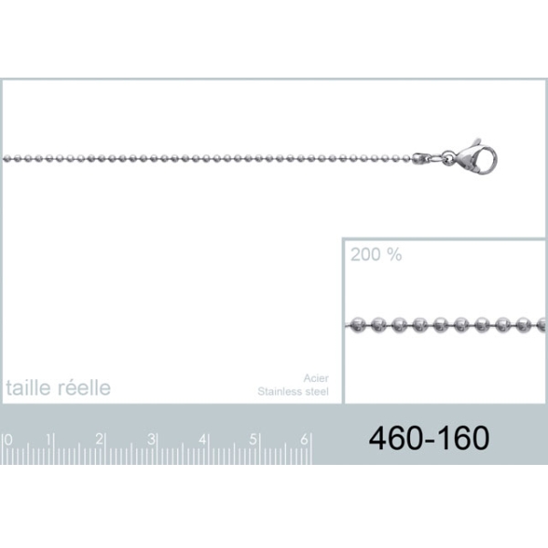 Description Chaîne en acier. Longueur 45 cm [Guide des tailles] Largeur 1.50 mm Maille Boule Matière(s) Acier . L'acier utilisé dans la bijouterie existe sous plusieurs qualités. Nous utilisons principalement la qualité 316L, qualité qui est utilisée en chirurgie. Cet acier est donc inoxydable et reste très résistant. Fermoir Mousqueton À noter Longueur 45 cm Couleur(s) dominante(s) Argenté Public Adulte . Genre Femme , Homme , Mixte . Saison Indémodable . Cliquez sur une matière, un thème, une couleur ou une collection pour voir tous les articles associés.