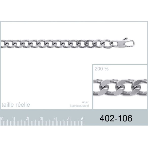 Description Bracelet en acier. Longueur 20 cm [Guide des tailles] Largeur 6 mm Maille Gourmette Matière(s) Acier . L'acier utilisé dans la bijouterie existe sous plusieurs qualités. Nous utilisons principalement la qualité 316L, qualité qui est utilisée en chirurgie. Cet acier est donc inoxydable et reste très résistant. Fermoir Mousqueton Couleur(s) dominante(s) Argenté Public Adulte . Genre Homme . Saison Indémodable . Rayon en magasin T15 Cliquez sur une matière, un thème, une couleur ou une collection pour voir tous les articles associés.