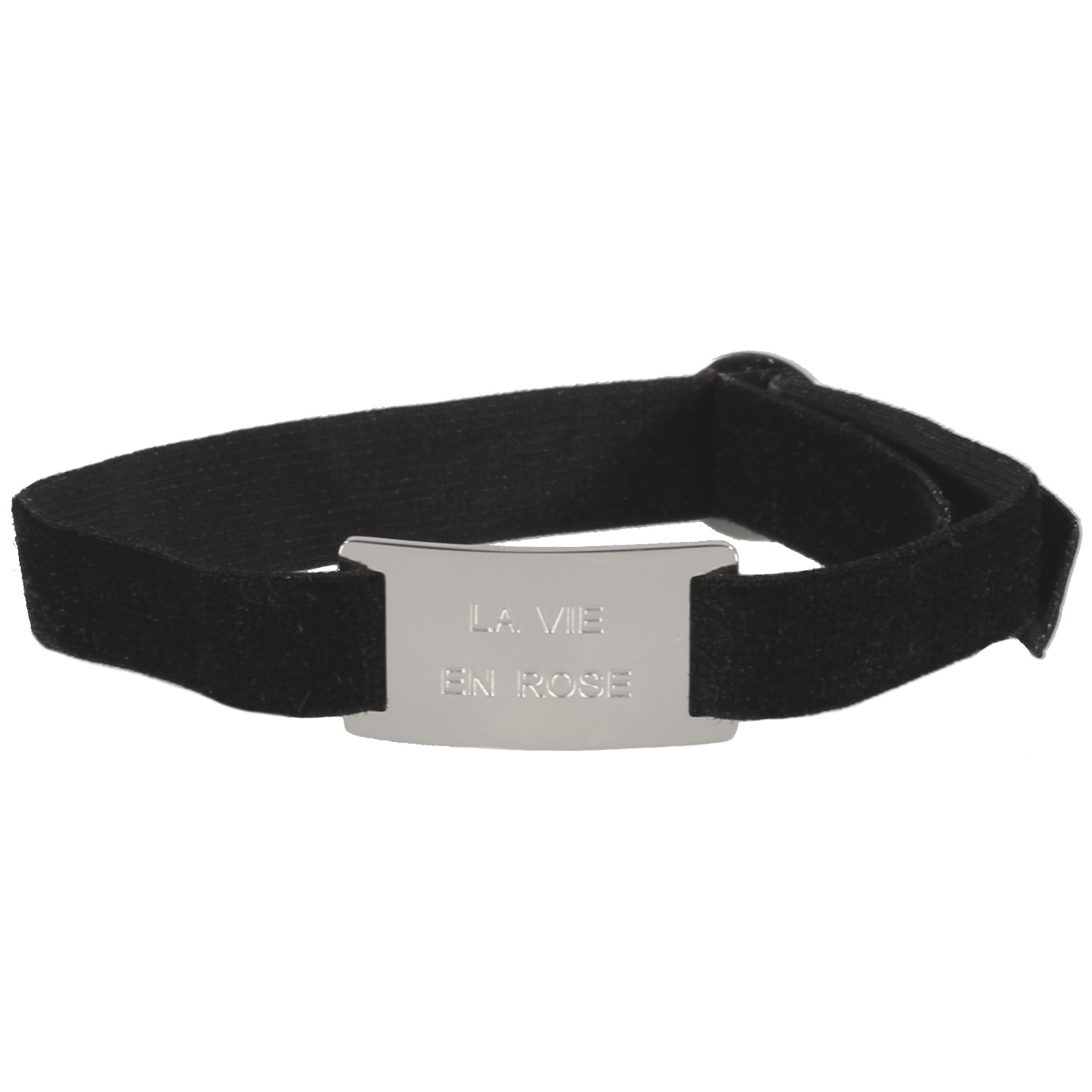 Bracelet élastique en velours et plaque en acier argenté avec l'inscription La vie en rose.