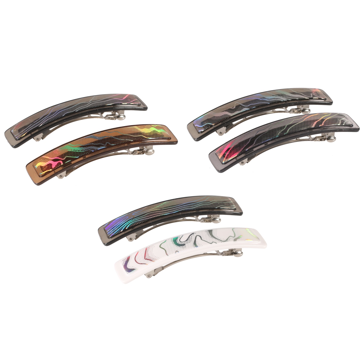 Lot de 2 barrettes pour cheveux en en métal argenté et plastique de couleur.
