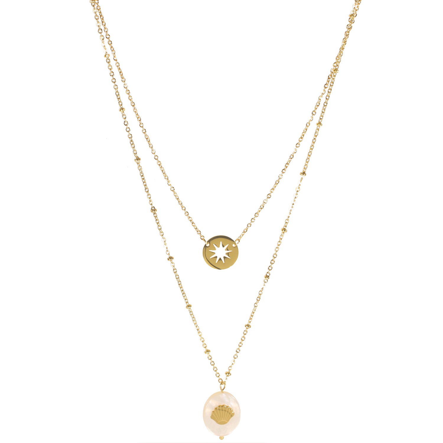 Collier multi rangs avec soleil ajouré et pendentif coquillage en acier doré et nacre.