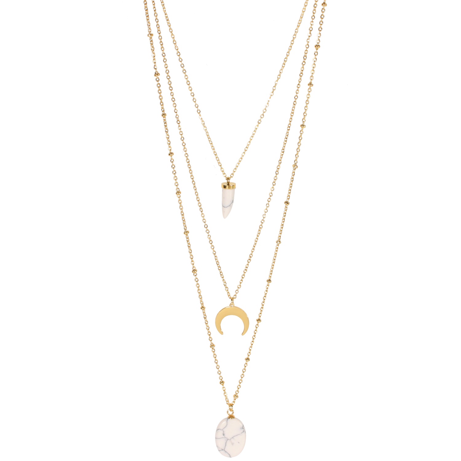 Description Collier triple rangs avec pendentifs en acier doré et pierre de couleur. Longueur 38+5 cm [Guide des tailles] Matière(s) Acier , Rocaille . L'acier utilisé dans la bijouterie existe sous plusieurs qualités. Nous utilisons principalement la qualité 316L, qualité qui est utilisée en chirurgie. Cet acier est donc inoxydable et reste très résistant. Fermoir Mousqueton À noter Pendentif 15x15 mm, pendentif ovale 20x13 mm, et dent 15x6 mm Couleur(s) dominante(s) Blanc , Doré Public Adolescent , Adulte . Genre Femme , Fille . Saison Indémodable . Collection Myriade Cliquez sur une matière, un thème, une couleur ou une collection pour voir tous les articles associés.