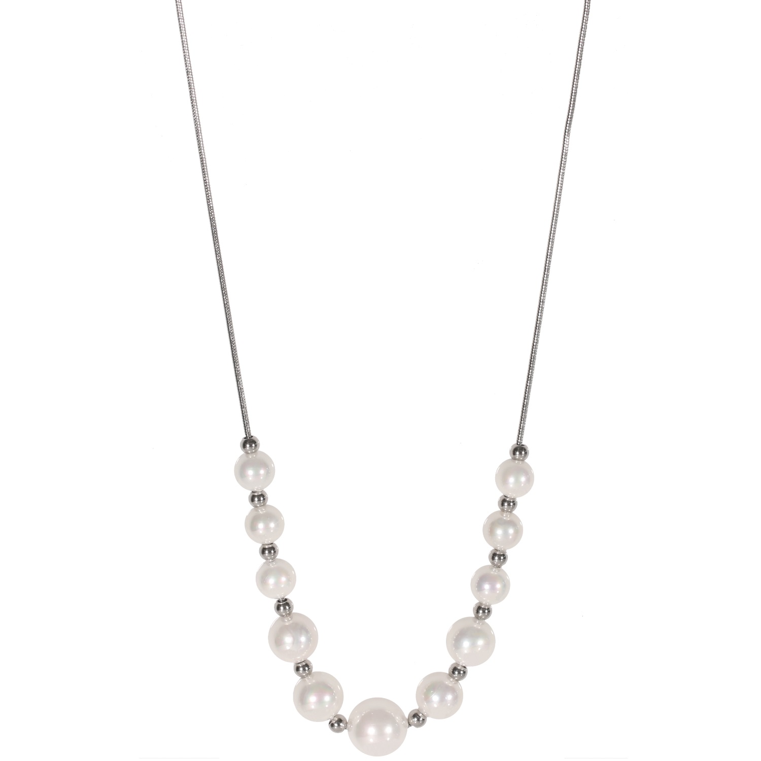 Description Collier de perles de tailles différentes en acier argenté et perles synthétiques. Cliquez sur une matière, un thème, une couleur ou une collection pour voir tous les articles associés.