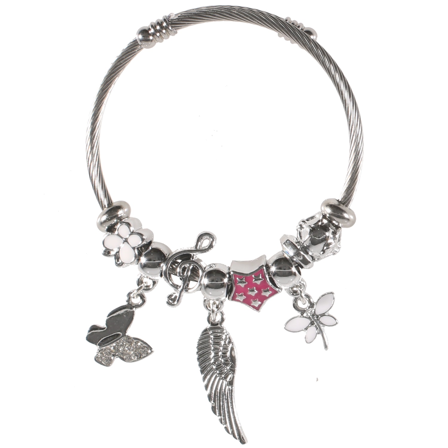 Bracelet fantaisie charm's avec breloques (Aile d'ange, papillon, clé de sol, libellule...) en métal argenté, strass et émail.