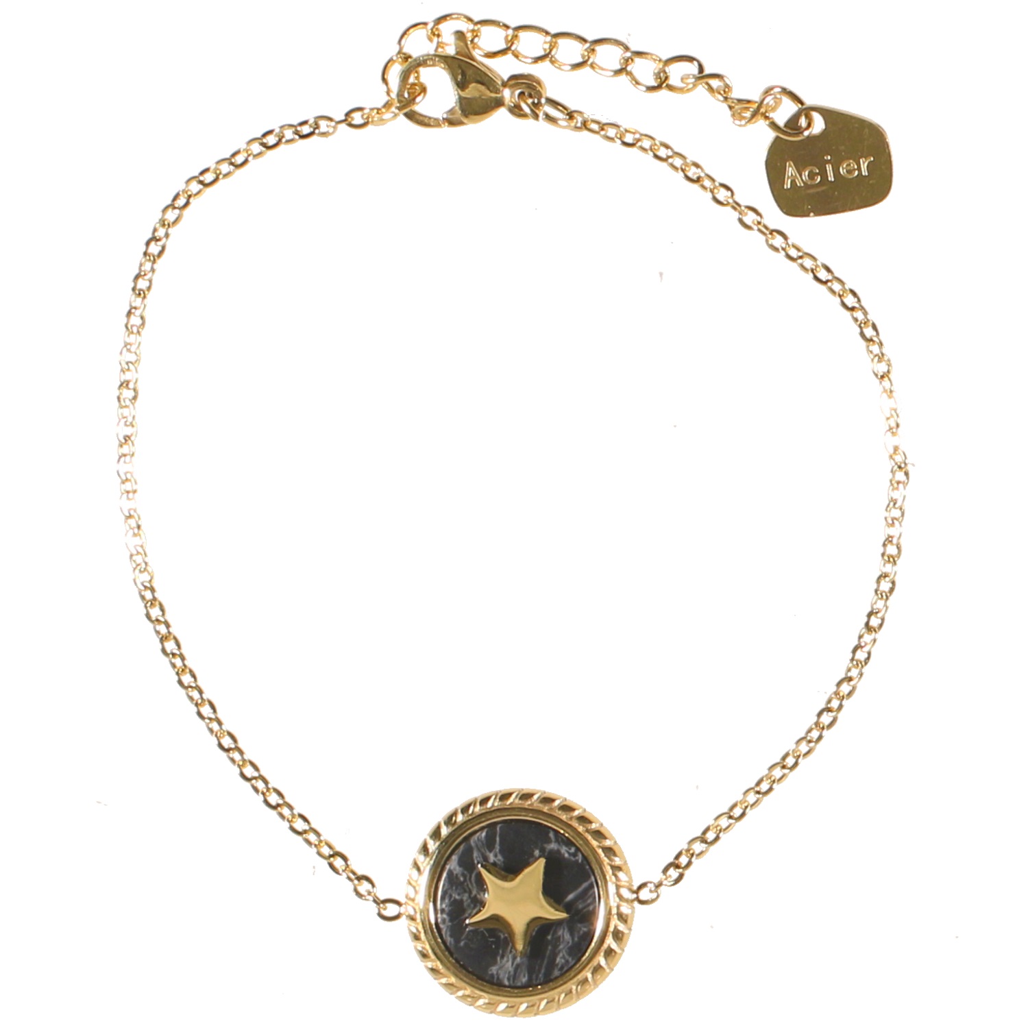 Description Bracelet avec pastille ronde motif étoile en acier doré et pierre de couleur. Longueur 15.5+2.5 cm [Guide des tailles] Largeur 14 mm Matière(s) Acier , Rocaille . L'acier utilisé dans la bijouterie existe sous plusieurs qualités. Nous utilisons principalement la qualité 316L, qualité qui est utilisée en chirurgie. Cet acier est donc inoxydable et reste très résistant. Fermoir Mousqueton Couleur(s) dominante(s) Doré , Noir Public Adolescent , Adulte . Genre Femme , Fille . Saison Indémodable . Cliquez sur une matière, un thème, une couleur ou une collection pour voir tous les articles associés.