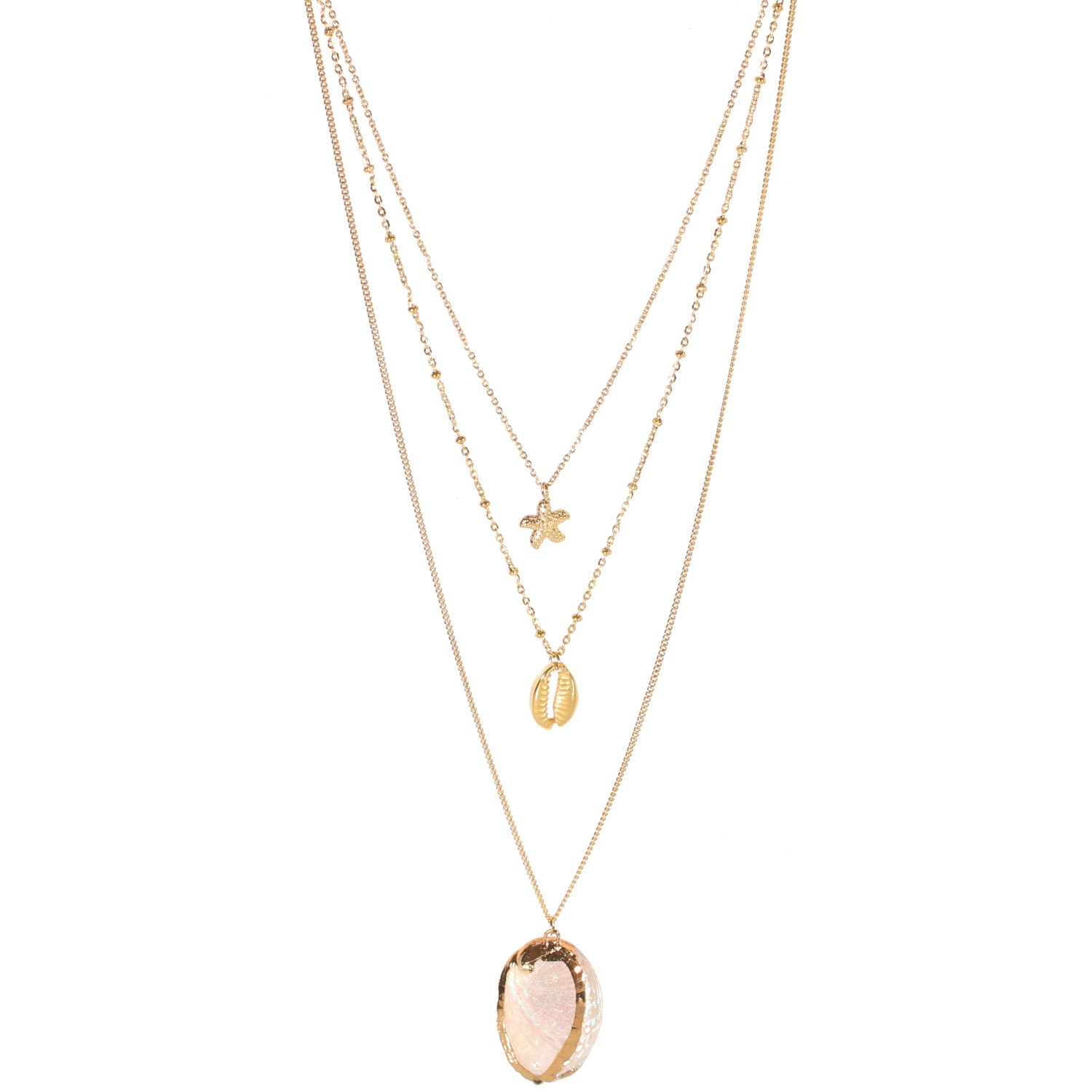 Description Collier triple rangs composé d'un collier de 38 cm de long avec pendentif étoile de mer en acier doré, un collier de 44 cm de long avec coquillage en acier doré ainsi qu'un collier de 54 cm de long en acier doré et pendentif coquillage nacre doré. L'ensemble peut se régler jusqu'à 7 cm. Longueur 38+7 cm [Guide des tailles] Matière(s) Acier , Rocaille . L'acier utilisé dans la bijouterie existe sous plusieurs qualités. Nous utilisons principalement la qualité 316L, qualité qui est utilisée en chirurgie. Cet acier est donc inoxydable et reste très résistant. Fermoir Mousqueton À noter Etoile 10 mm, coquillage 10x15 mm, coquillage 22x30 mm Couleur(s) dominante(s) Doré Public Adolescent , Adulte . Genre Femme , Fille . Saison Indémodable . Thème(s) Nature . Collection Myriade , Seaside Cliquez sur une matière, un thème, une couleur ou une collection pour voir tous les articles associés.