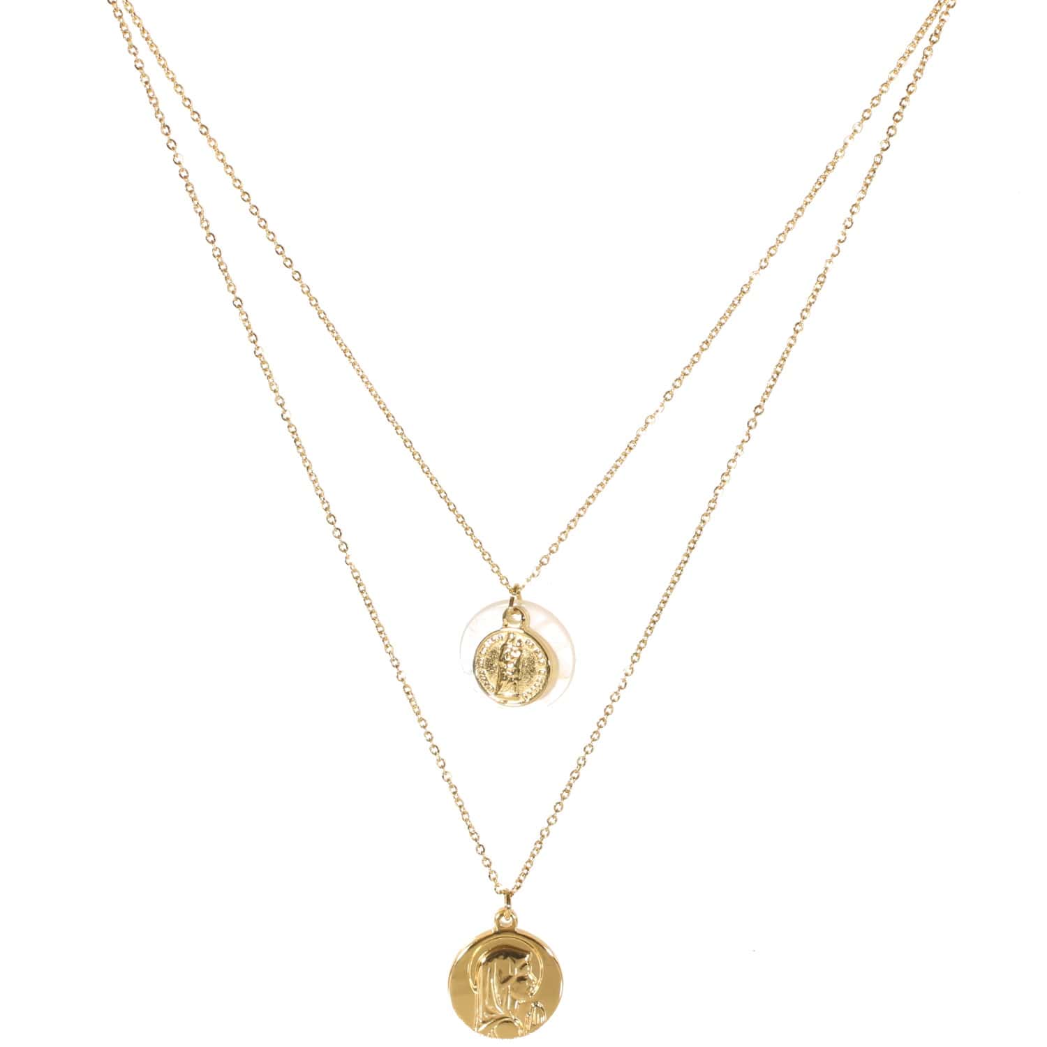 Collier sautoir double rangs composé d'un collier de 37 cm de long avec pendentif de la Vierge en acier doré et pastille en nacre ainsi qu'un collier de 46 cm de long avec pendentif de la Vierge en acier doré.