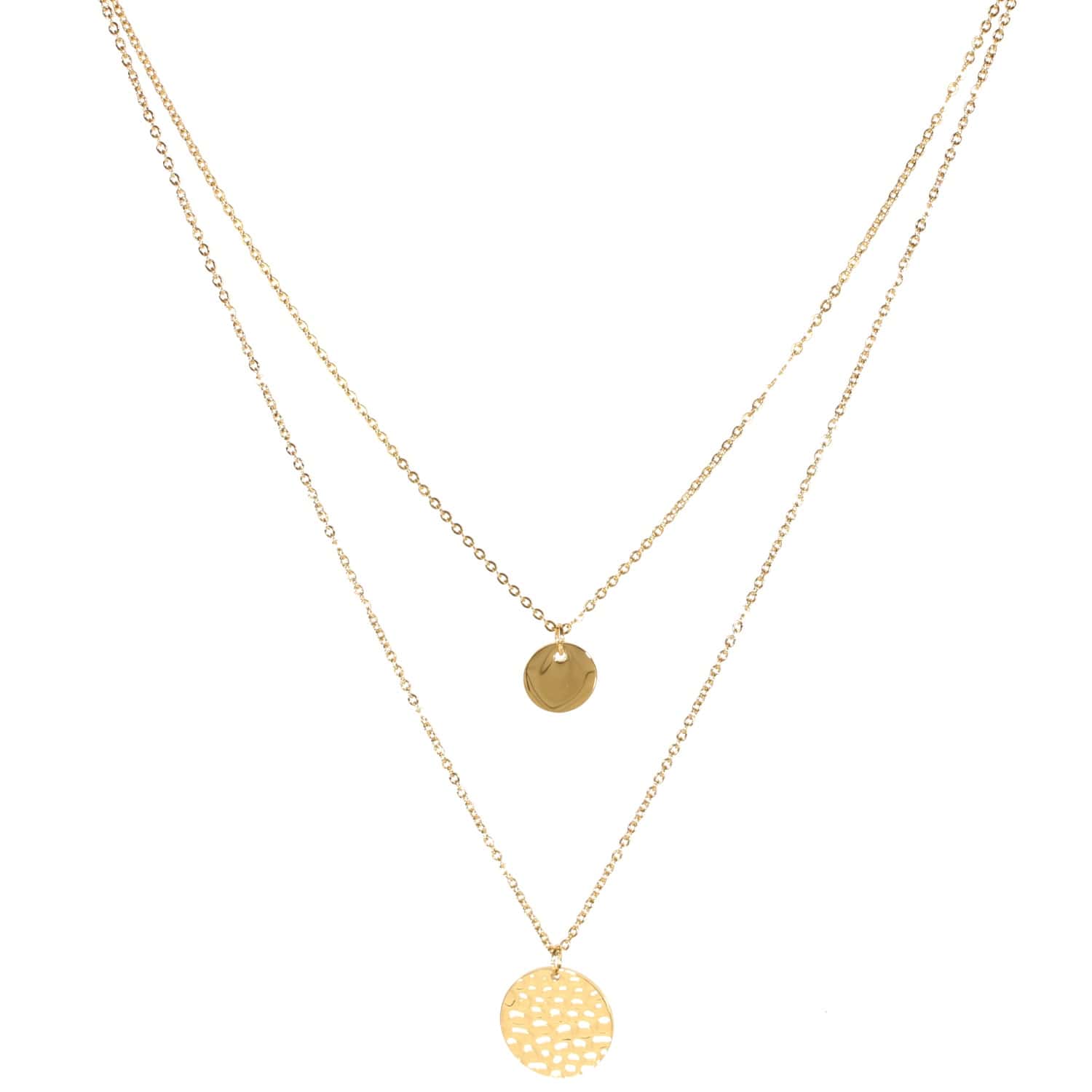 Description Collier sautoir double rangs composé d'un collier de 38 cm de long avec pastille lisse en acier doré ainsi qu'un collier de 45 cm de long avec pastille martelée en acier doré. L'ensemble peut se régler jusqu'à 5 cm. Longueur 38+5 cm [Guide des tailles] Matière(s) Acier . L'acier utilisé dans la bijouterie existe sous plusieurs qualités. Nous utilisons principalement la qualité 316L, qualité qui est utilisée en chirurgie. Cet acier est donc inoxydable et reste très résistant. Fermoir Mousqueton À noter Pastille lisse de 10 mm de diamètre et pastille martelée 16 mm de diamètre Couleur(s) dominante(s) Doré Public Adolescent , Adulte . Genre Femme , Fille . Saison Indémodable . Collection Myriade , Reflets Cliquez sur une matière, un thème, une couleur ou une collection pour voir tous les articles associés.