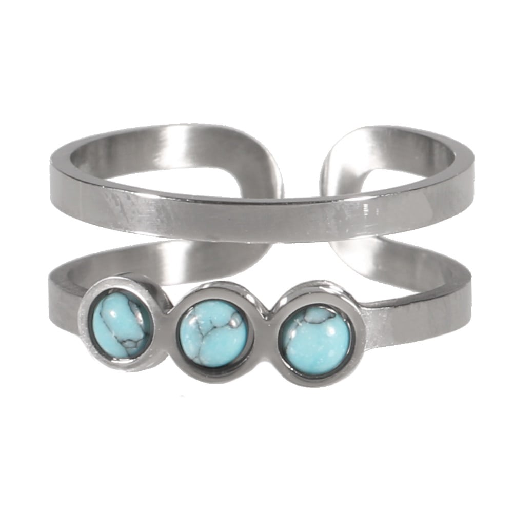 Description Bague en acier argenté et pierres d'imitation turquoise. Cliquez sur une matière, un thème, une couleur ou une collection pour voir tous les articles associés.