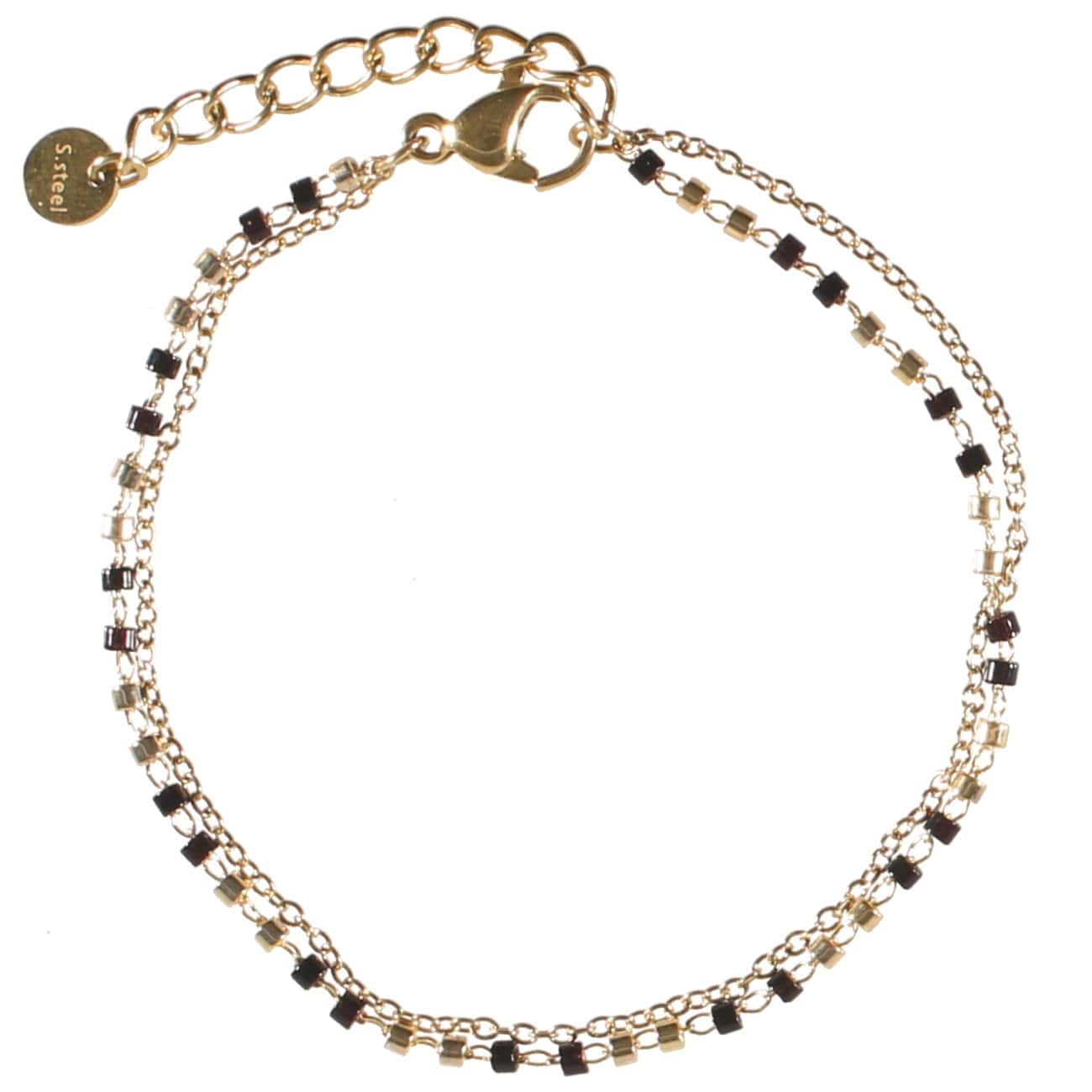 Description Bracelet double rangs composé d'une chaîne en acier doré et d'une chaîne avec perles en acier doré et perles de couleur noire. Fermoir mousqueton avec rallonge de 3 cm. Longueur 14.5+3 cm [Guide des tailles] Largeur 3 mm Matière(s) Acier , Rocaille . L'acier utilisé dans la bijouterie existe sous plusieurs qualités. Nous utilisons principalement la qualité 316L, qualité qui est utilisée en chirurgie. Cet acier est donc inoxydable et reste très résistant. Fermoir Mousqueton Couleur(s) dominante(s) Doré , Noir Public Adolescent , Adulte . Genre Femme , Fille . Saison Eté . Collection Zeste d'été Cliquez sur une matière, un thème, une couleur ou une collection pour voir tous les articles associés.
