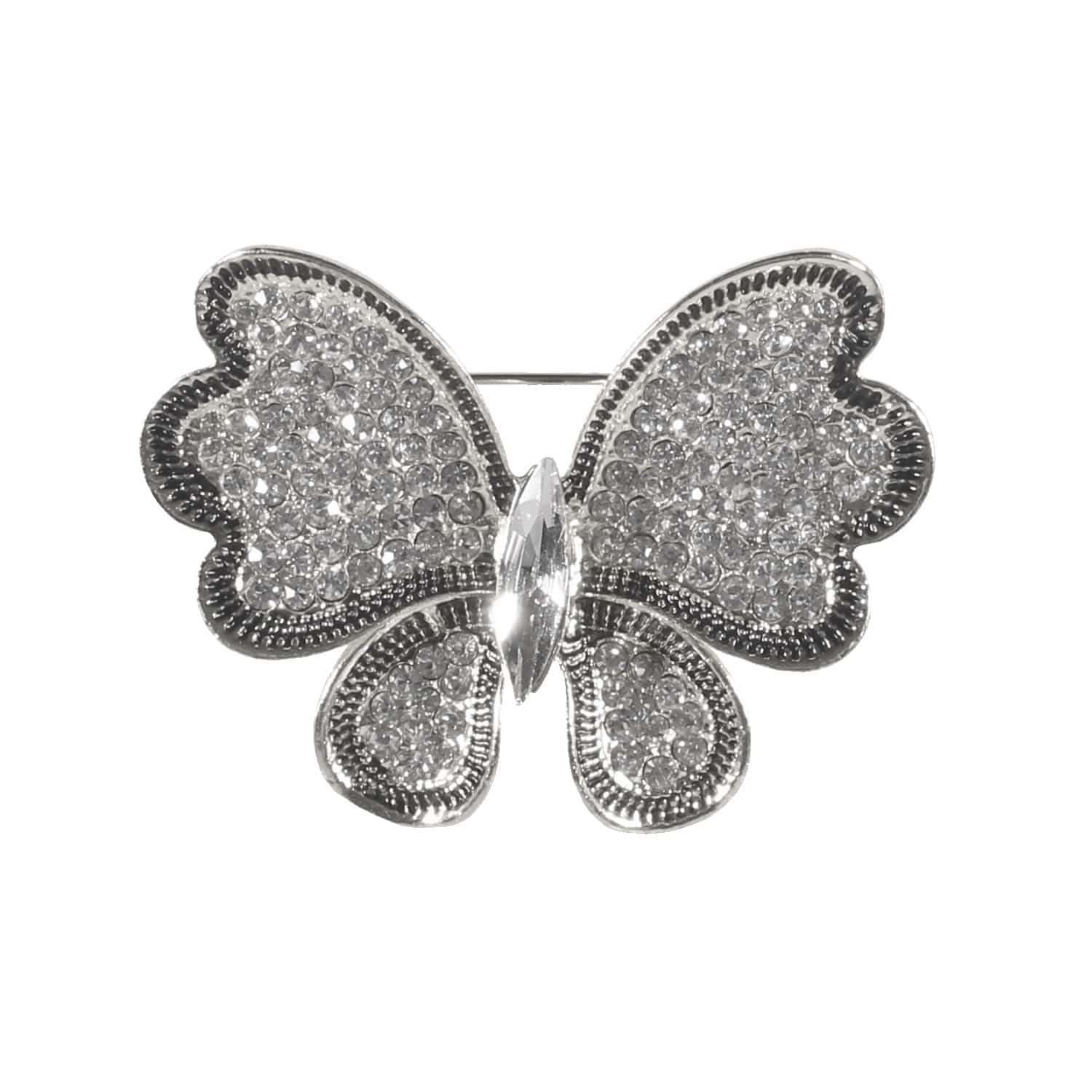Broche fantaisie papillon en métal argenté et strass en verre.