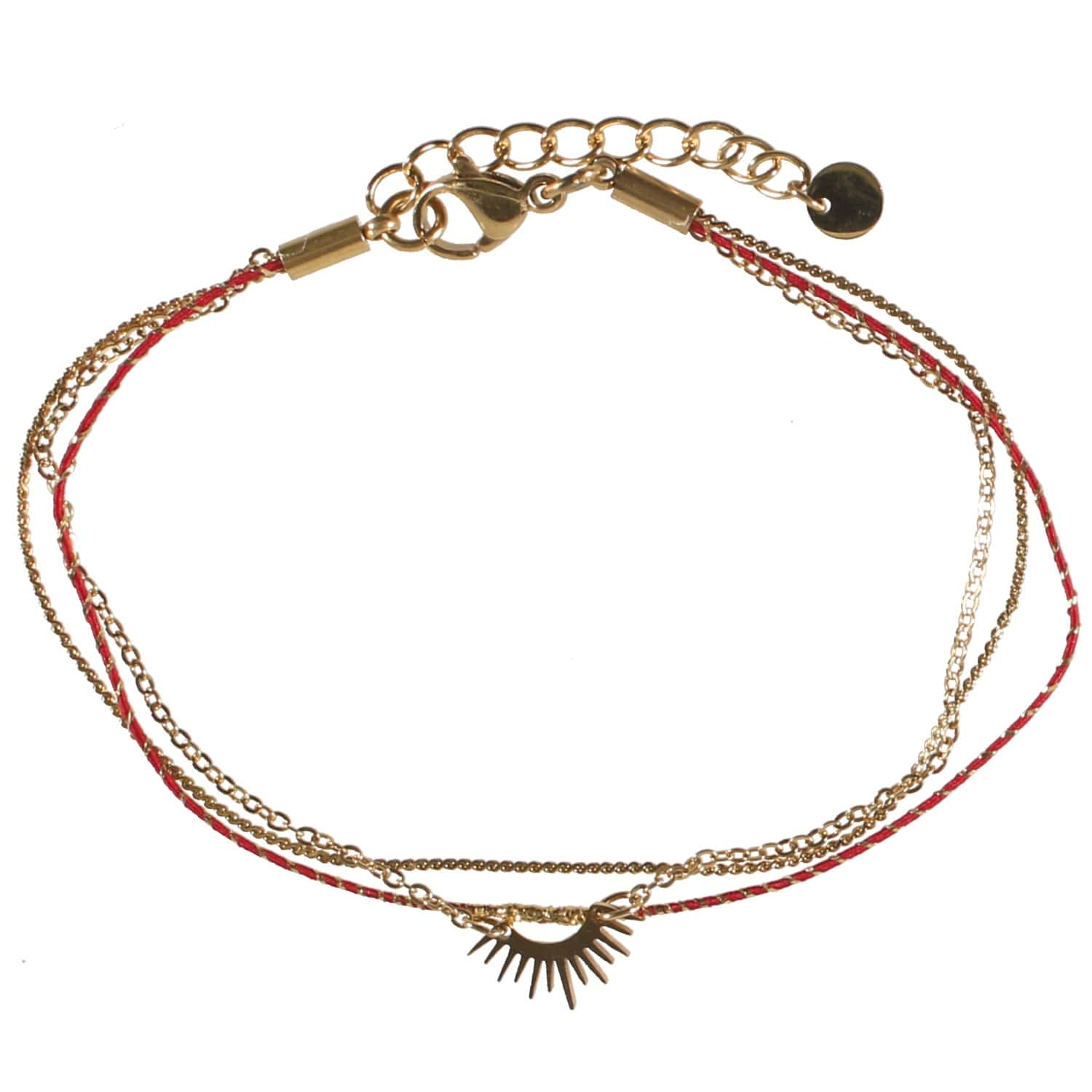 Bracelet triple rangs composé d'un bracelet en textile et fil doré, une chaîne en acier doré et une chaîne avec demi rayons de soleil en acier doré.