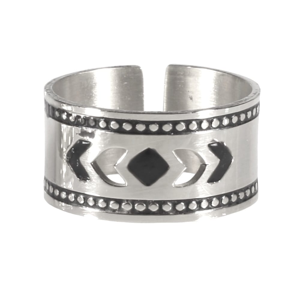 Description Bague avec motifs de flèches ajourés en acier argenté finition brillante et émail de couleur noire. Taille ajustable. Largeur 10 mm Matière(s) Acier , Email . L'acier utilisé dans la bijouterie existe sous plusieurs qualités. Nous utilisons principalement la qualité 316L, qualité qui est utilisée en chirurgie. Cet acier est donc inoxydable et reste très résistant. Couleur(s) dominante(s) Argenté , Noir Public Adolescent , Adulte . Genre Femme , Fille . Saison Indémodable . Collection Indian spirit Cliquez sur une matière, un thème, une couleur ou une collection pour voir tous les articles associés.