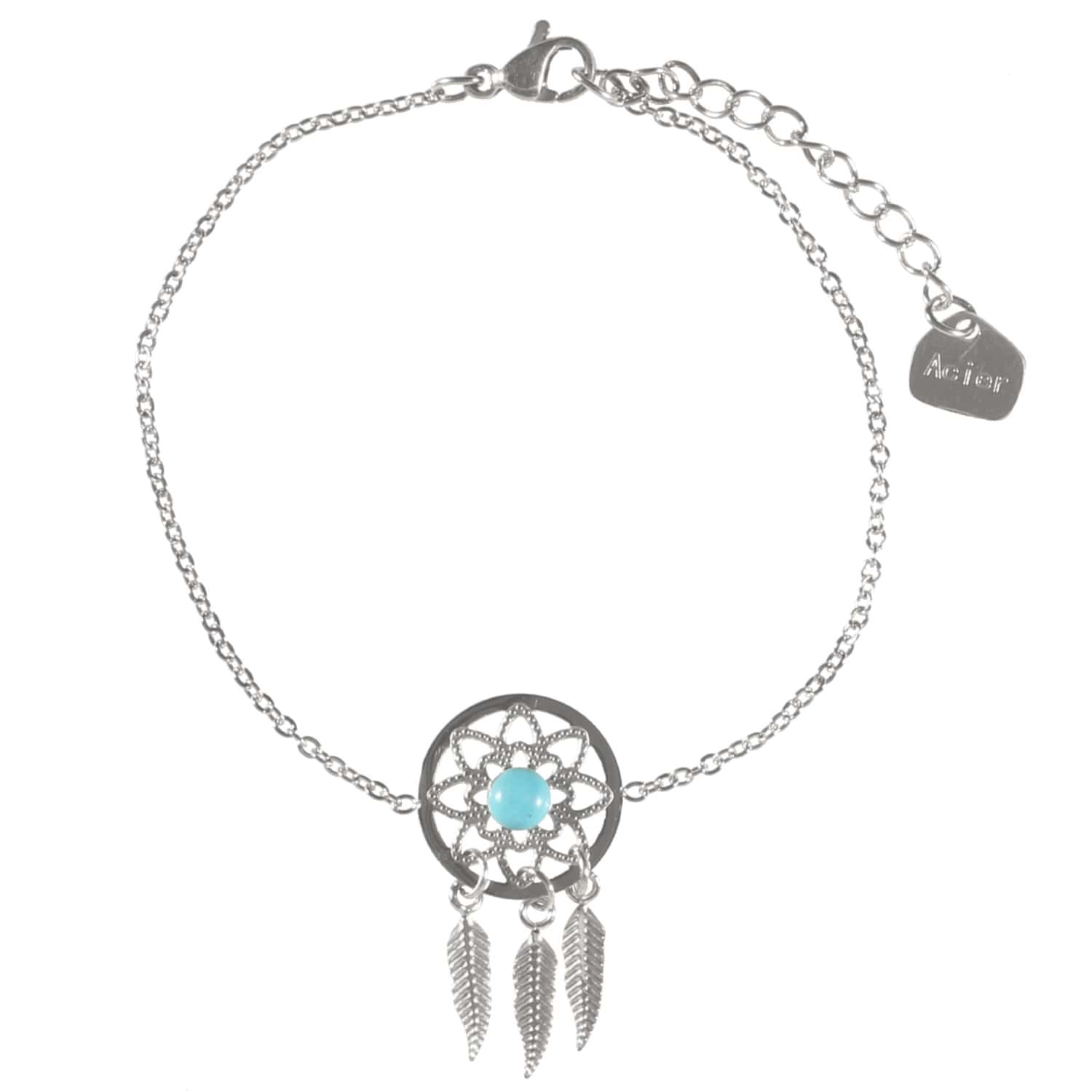 Description Bracelet avec attrape-rêve et trois plumes en acier argenté et pierre d'imitation turquoise. Fermoir mousqueton en acier argenté avec rallonge de 3 cm. Cliquez sur une matière, un thème, une couleur ou une collection pour voir tous les articles associés.