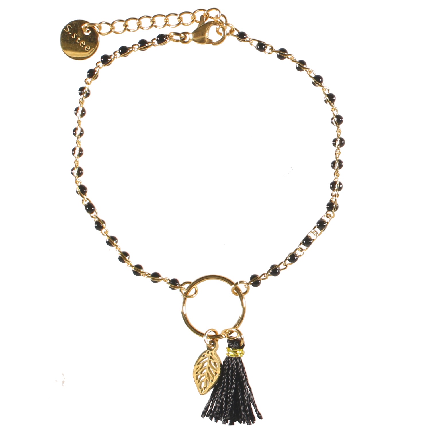 Bracelet avec cercle et feuille pendante en acier doré, perles en émail et pompon en textile.