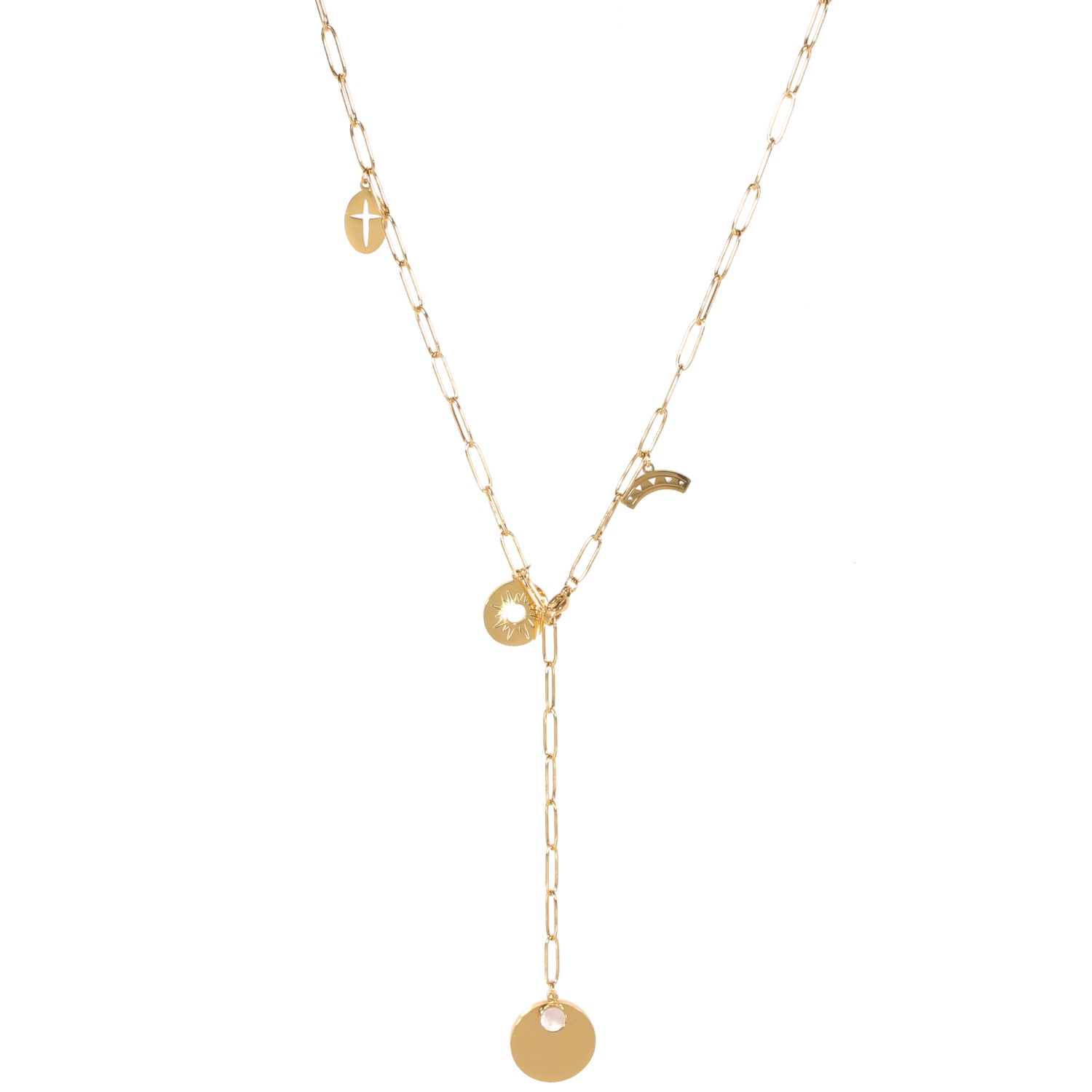 Collier sautoir de forme Y avec différents pendants (pastille ovale avec croix ajourée, pastille ronde avec motif du soleil, arc de cercle avec triangles ajourés) et pendentif rond en acier doré monté de nacre de forme ronde.