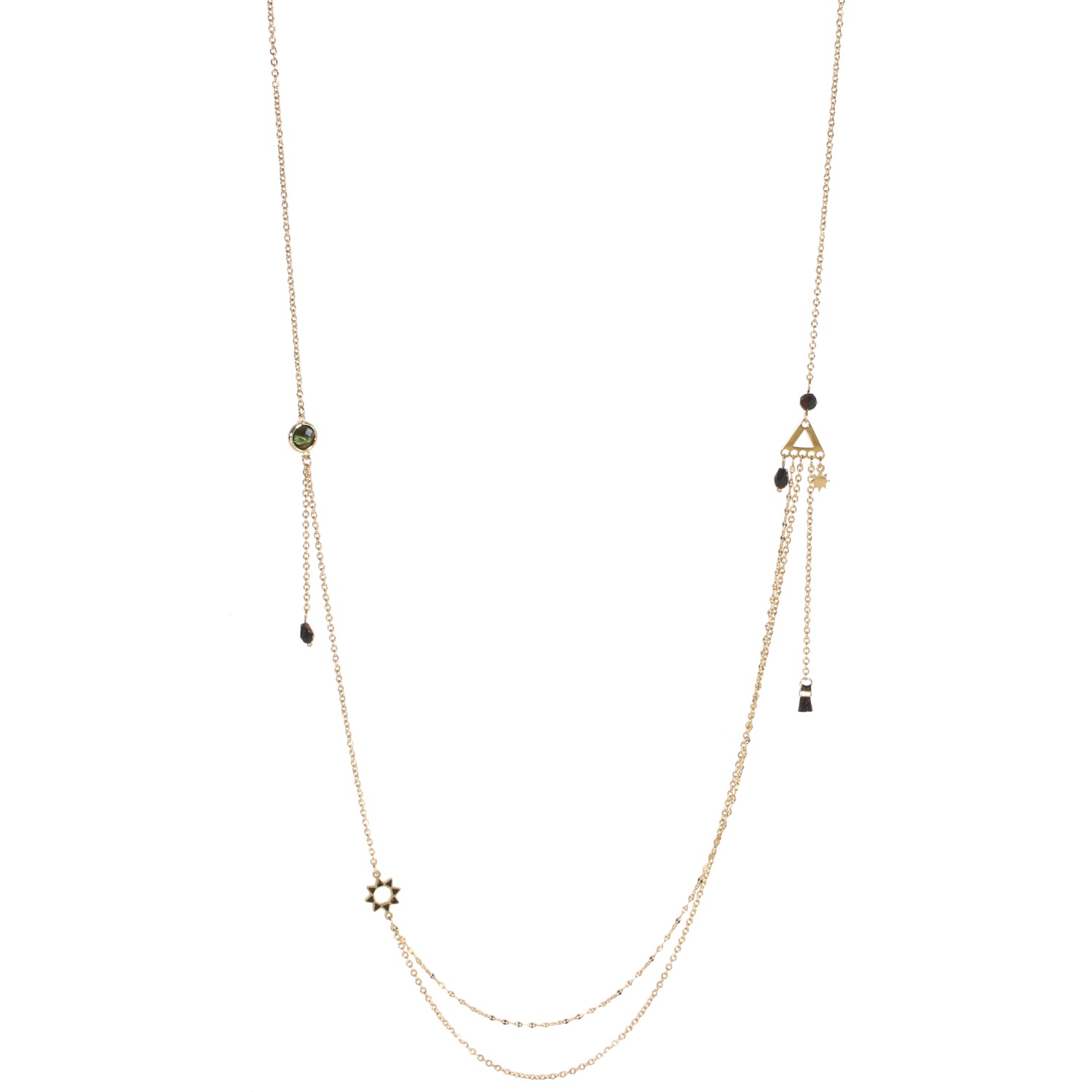 collier sautoir double rangs composé d'un collier de 78 cm de long en acier doré surmonté de perles de couleur, une étoile en émail et un mini pompon en textile ainsi qu'un collier de 81 cm de long en acier doré.