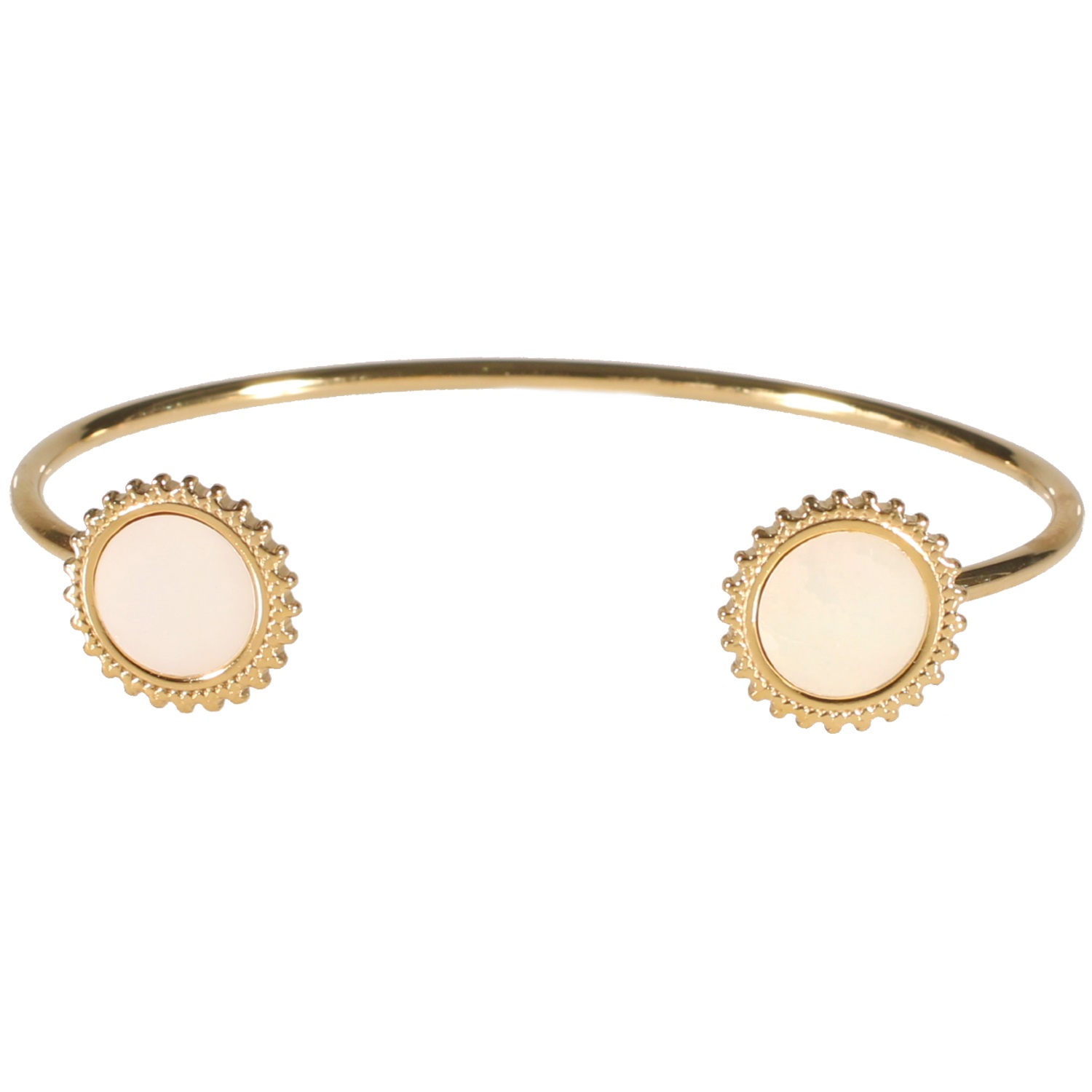 Bracelet jonc semi rigide fil rond en acier doré finissant sur 2 médaillons de forme ronde aux contours en relief pour donner un motif de soleil incrustés de pierres de nacre.