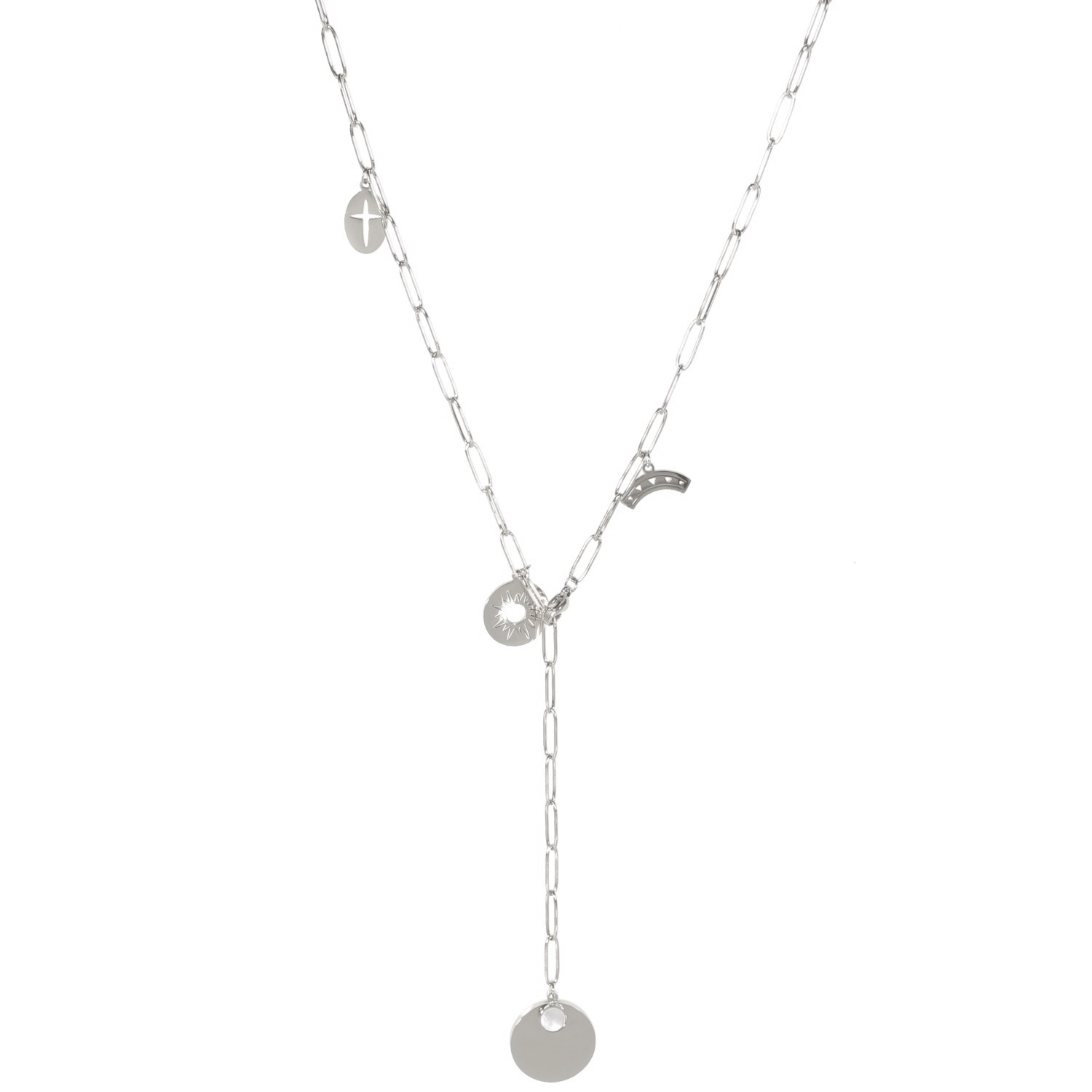 Collier sautoir de forme Y avec différents pendants (pastille ovale avec croix ajourée, pastille ronde avec motif du soleil, arc de cercle avec triangles ajourés) et pendentif rond en acier doré monté de nacre de forme ronde.