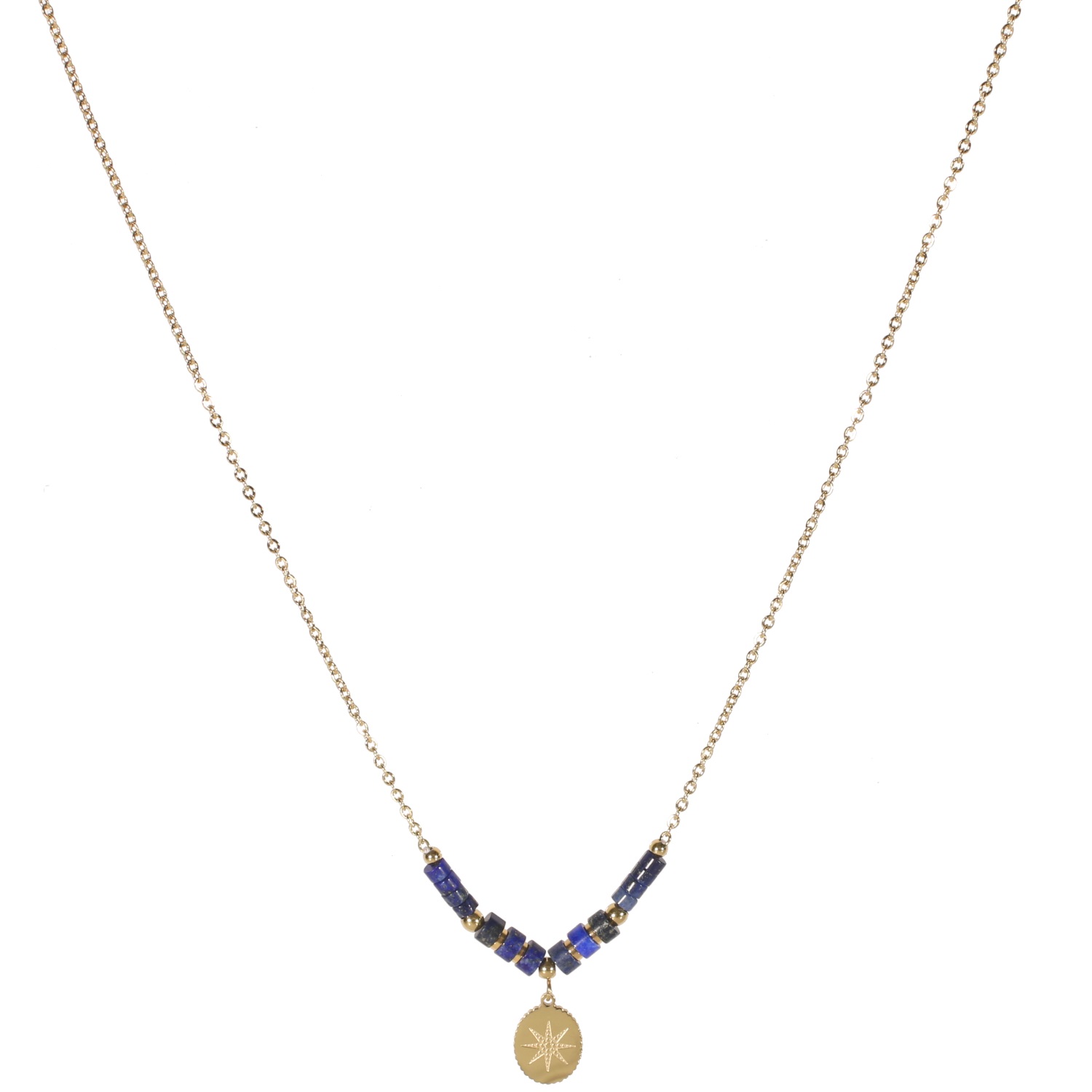 Collier chaîne en acier doré finissant par des perles cylindriques de couleur bleue et un pendentif de forme ovale avec motif d'étoile gravé.