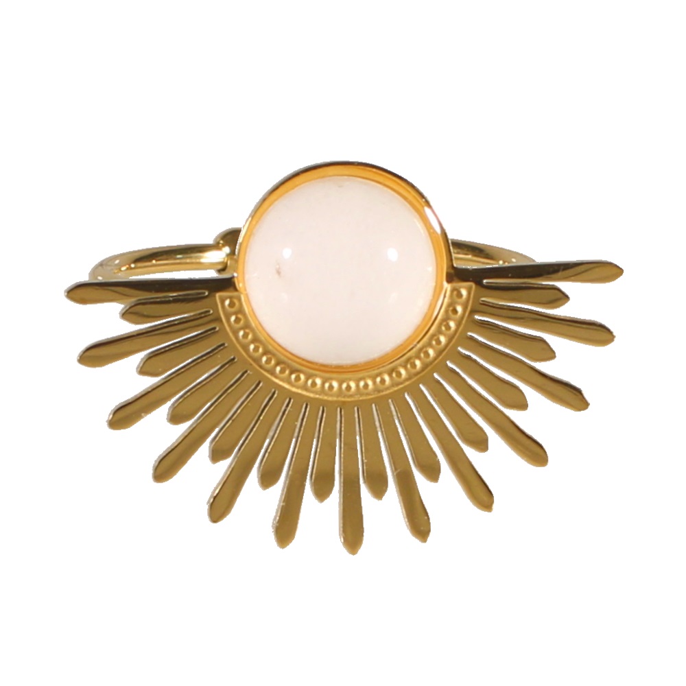 Description Bague avec demi rayons de soleil en acier doré surmontée d'une pierre de couleur blanche. Taille ajustable. Cliquez sur une matière, un thème, une couleur ou une collection pour voir tous les articles associés.