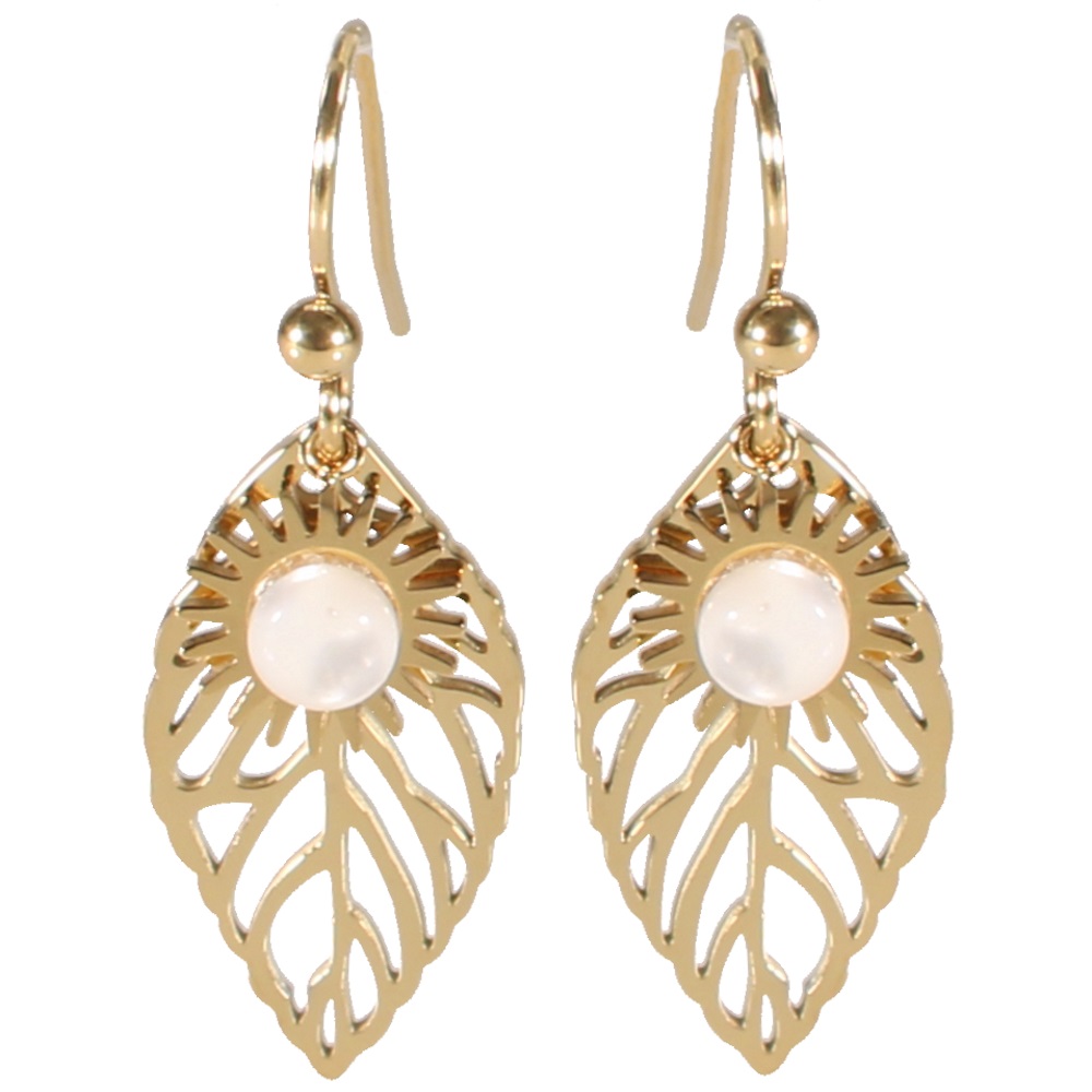 Boucles d'oreilles pendantes composées d'une feuille en acier doré et d'un soleil en acier doré surmonté d'une véritable pierre de lune.