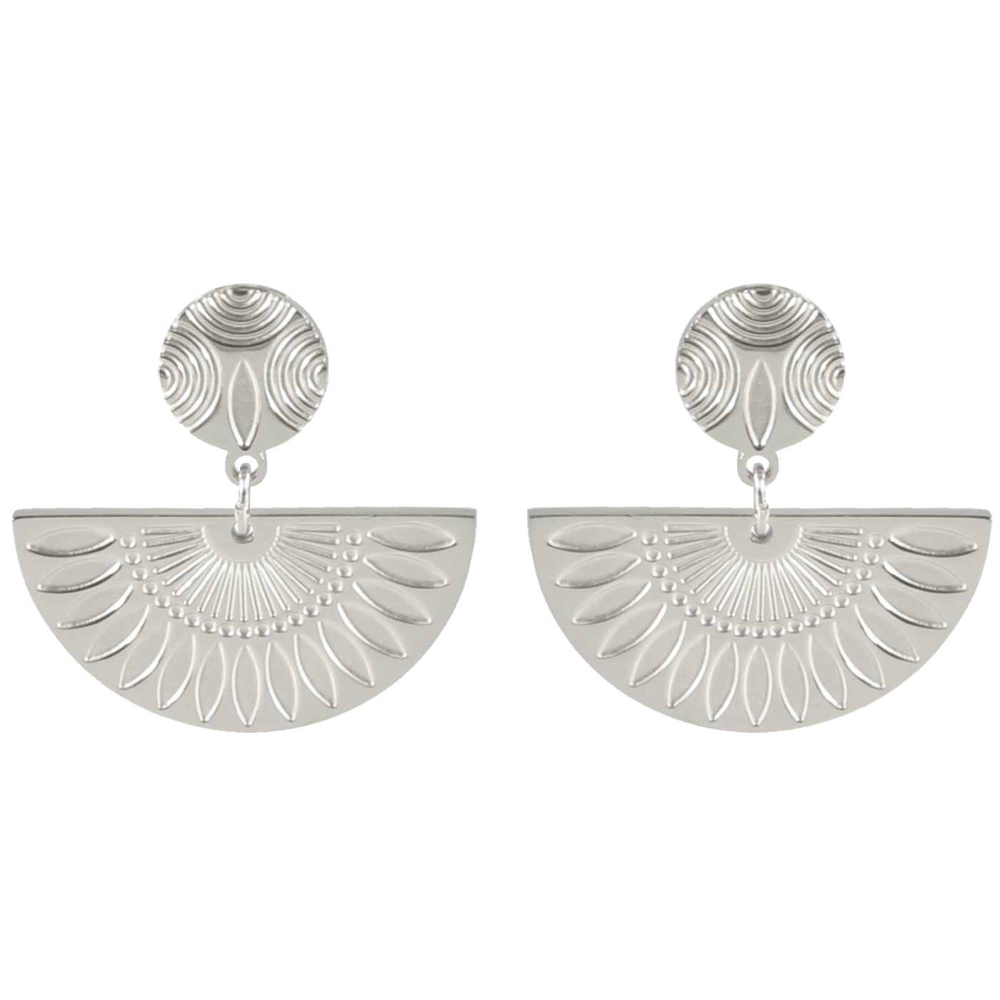 Description Boucles d'oreilles pendantes composées de puce ronde et d'un demi rond pendant au motif d'éventail en acier argenté. Largeur 22 mm Hauteur 22 mm Matière(s) Acier . L'acier utilisé dans la bijouterie existe sous plusieurs qualités. Nous utilisons principalement la qualité 316L, qualité qui est utilisée en chirurgie. Cet acier est donc inoxydable et reste très résistant. Fermoir Tiges poussettes Couleur(s) dominante(s) Argenté Public Adolescent , Adulte . Genre Femme , Fille . Saison Eté , Printemps . Cliquez sur une matière, un thème, une couleur ou une collection pour voir tous les articles associés.