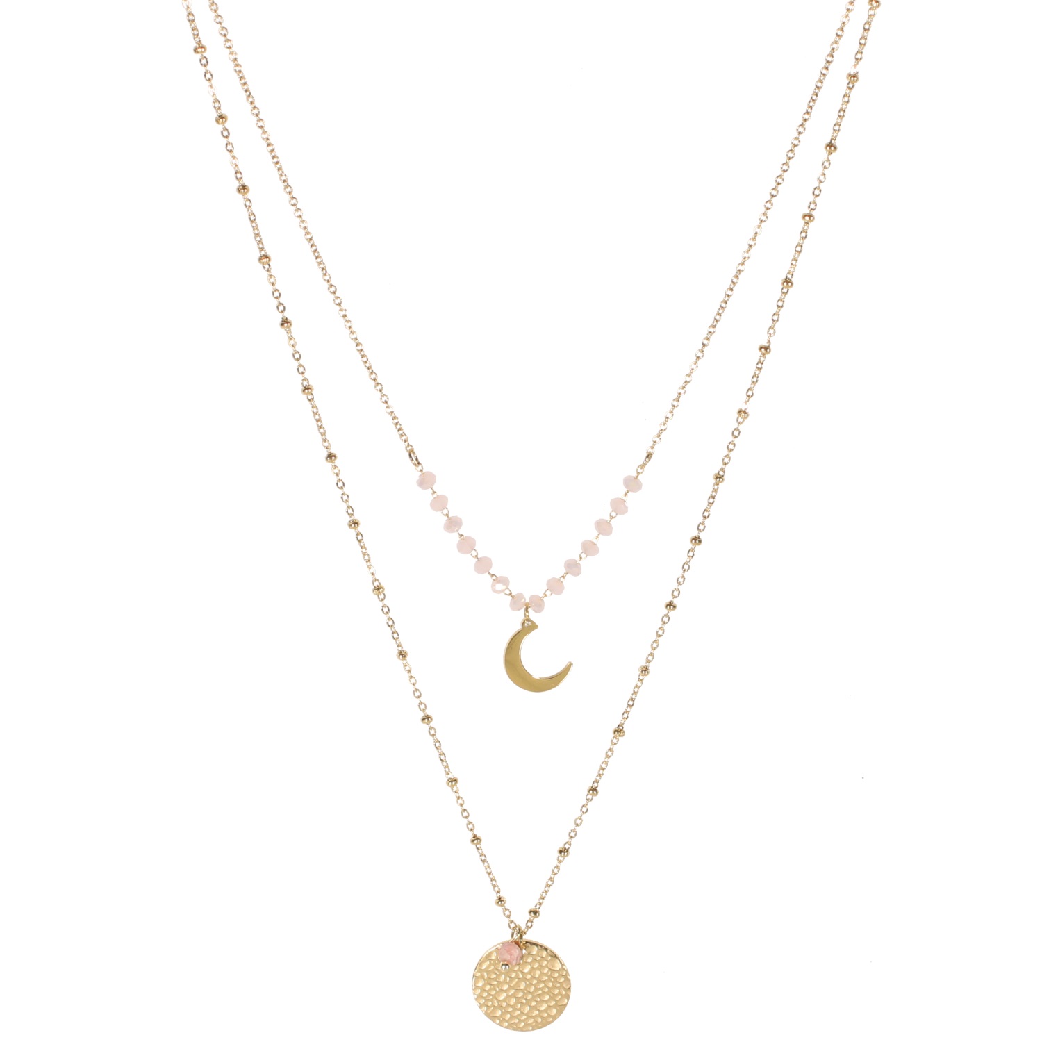 Collier double rangs composé d'un collier chaîne de 41 cm de long avec pendentif croissant de lune en acier doré et perles de couleur noire, ainsi qu'un collier chaîne de 50 cm de long avec pendentif rond martelé en acier doré et une perle pendante de couleur noire.