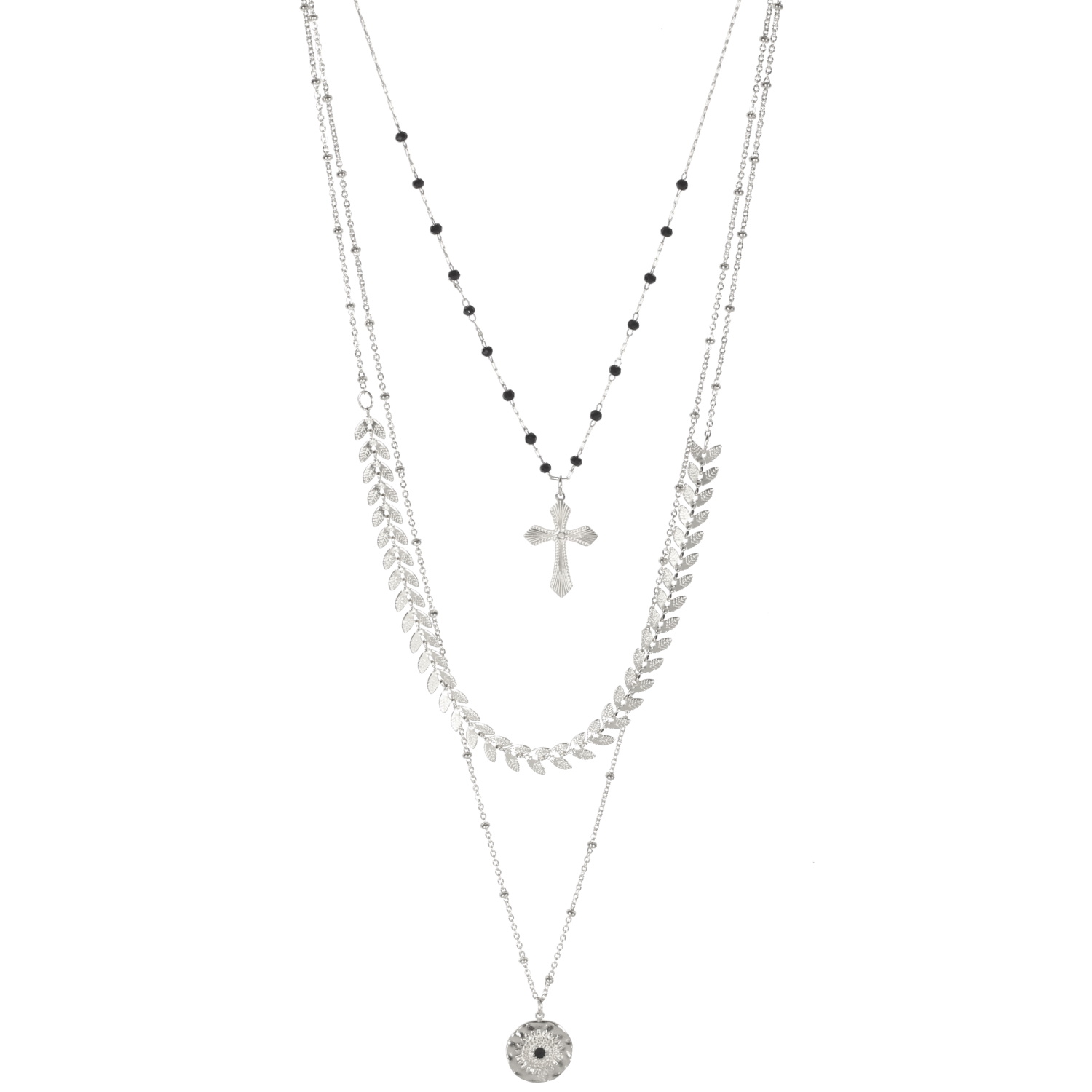 Collier triple rangs composé d'une chaîne de 40 cm de long avec un pendentif croix en acier argenté et perles de couleur noire, une chaîne de 50 cm de long avec feuilles de laurier en acier argenté, ainsi qu'une chaîne de 60 cm de long en acier argenté avec pendentif rond martelé et motif de tournesol centré d'un point en émail de couleur noire.