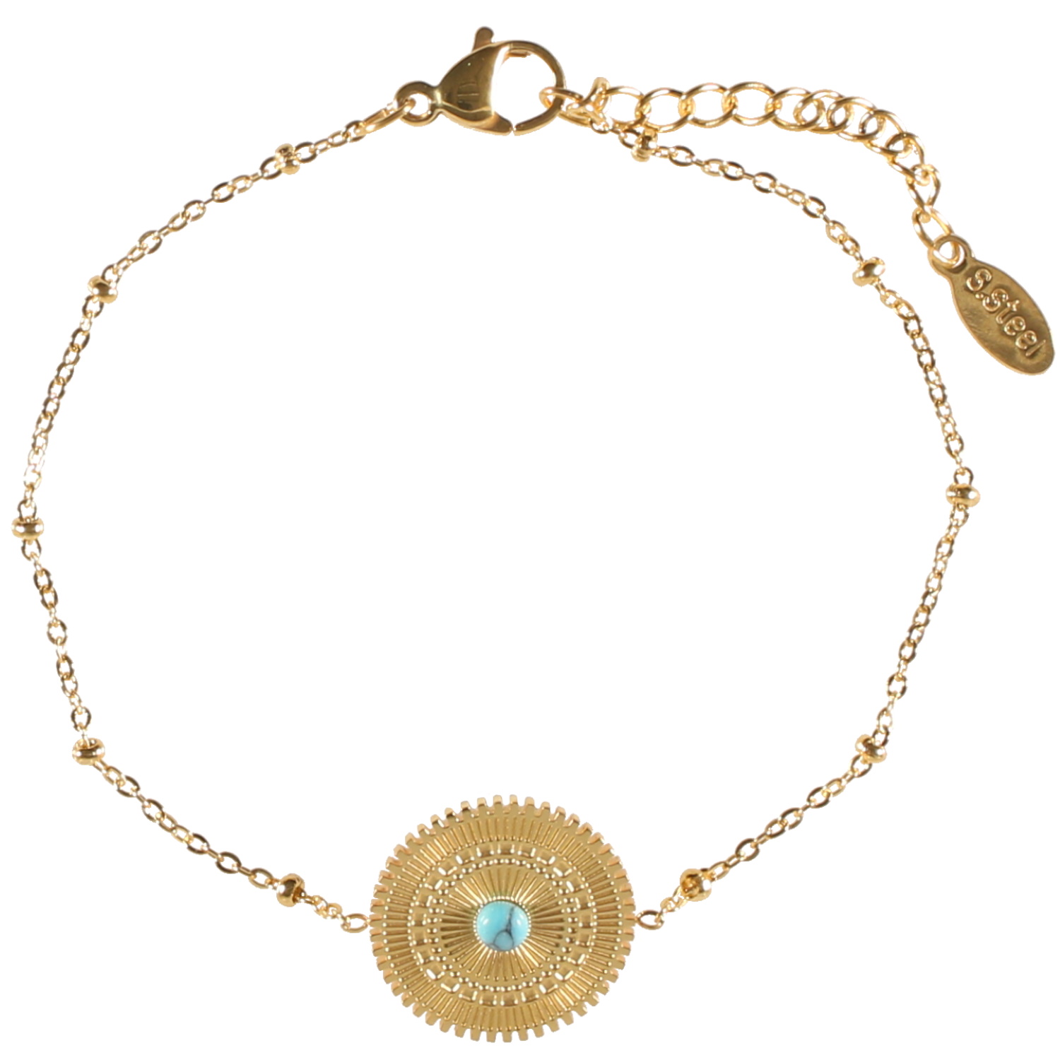 Description Bracelet composé d'une chaîne en acier doré et d'une pastille ronde avec motifs en acier doré surmontée d'une pierre d'imitation turquoise. Fermoir mousqueton avec 3 cm de rallonge. Longueur 17+3 cm [Guide des tailles] Largeur 15 mm Matière(s) Acier , Rocaille . L'acier utilisé dans la bijouterie existe sous plusieurs qualités. Nous utilisons principalement la qualité 316L, qualité qui est utilisée en chirurgie. Cet acier est donc inoxydable et reste très résistant. Fermoir Mousqueton Couleur(s) dominante(s) Bleu , Doré Public Adolescent , Adulte . Genre Femme , Fille . Saison Indémodable . Cliquez sur une matière, un thème, une couleur ou une collection pour voir tous les articles associés.