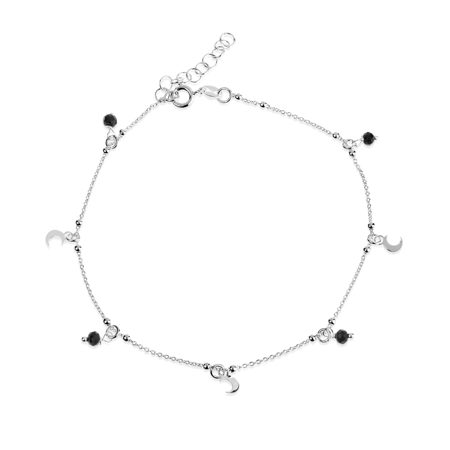 Bracelet chaîne de cheville composé d'une chaîne avec pampilles croissants de lune en argent 925/000 rhodié et perles de couleur noire.