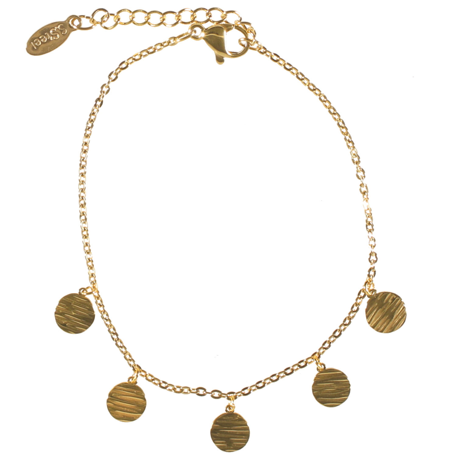 Description Bracelet avec 5 pampilles rondes martelées en acier 316L doré. Fermoir mousqueton avec 3 cm de rallonge. Longueur 16+3 cm [Guide des tailles] Largeur 9 mm Matière(s) Acier . L'acier utilisé dans la bijouterie existe sous plusieurs qualités. Nous utilisons principalement la qualité 316L, qualité qui est utilisée en chirurgie. Cet acier est donc inoxydable et reste très résistant. Fermoir Mousqueton Couleur(s) dominante(s) Doré Public Adolescent , Adulte . Genre Femme , Fille . Saison Indémodable . Cliquez sur une matière, un thème, une couleur ou une collection pour voir tous les articles associés.