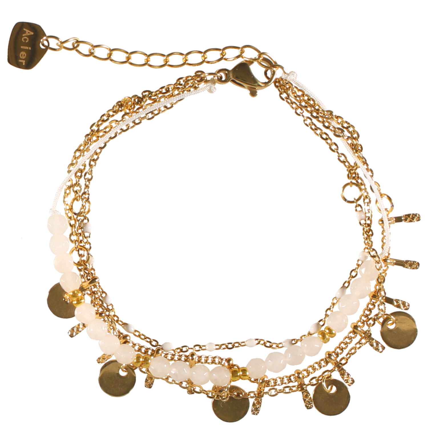 Bracelet quatre rangs composé d'une chaîne avec pampilles rondes en acier doré, une chaîne en acier doré avec perles en émail de couleur blanche, une chaîne avec pampilles en acier doré, ainsi qu'un cordon en coton avec perles de couleur blanche.