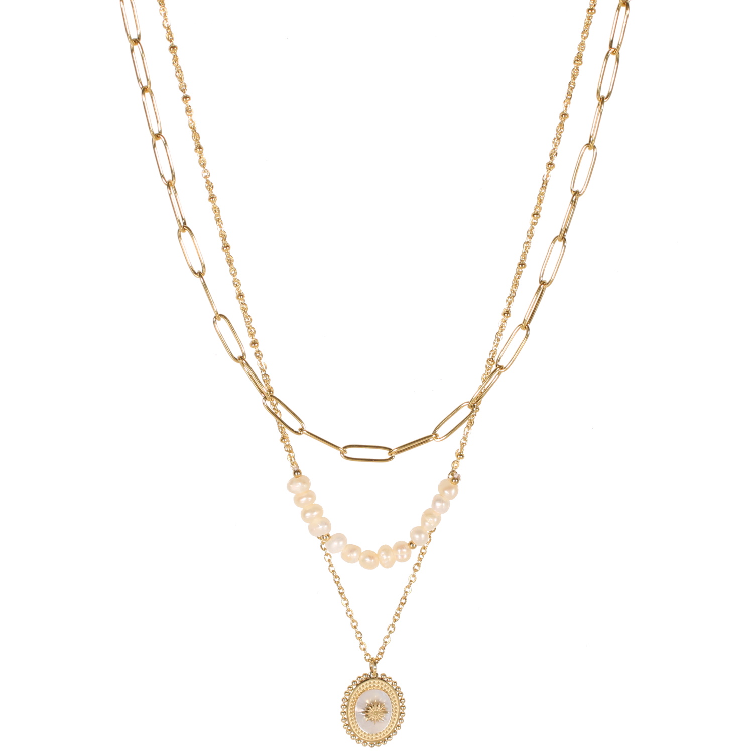 Collier triple rangs composé d'une chaîne de 40 cm de long en acier doré, une chaîne de 42 cm de long en acier doré avec perles de nacre, ainsi qu'une chaîne de 45 cm de long en acier doré avec un pendentif ovale pavé de nacre surmontée d'une étoile en acier doré.