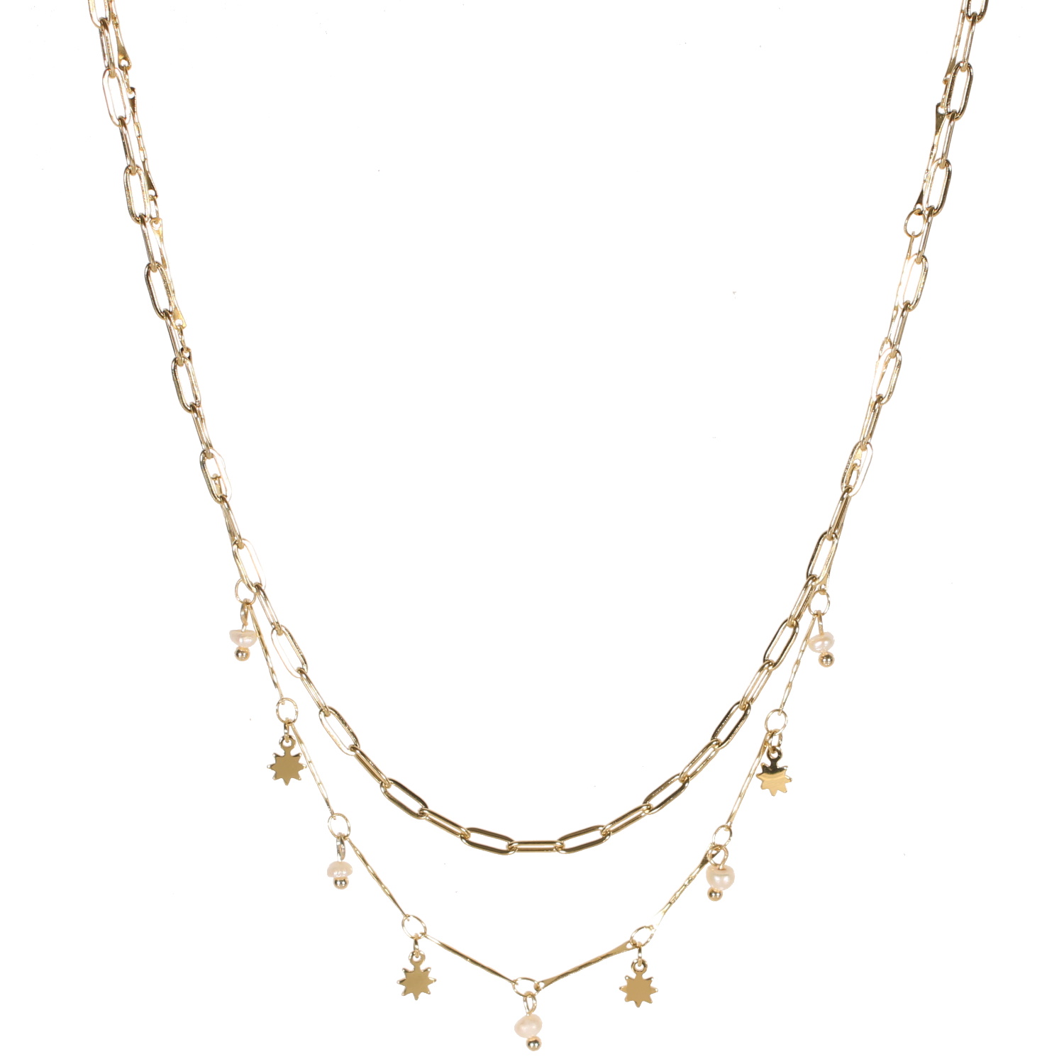Collier double rangs composé d'une chaîne de 38 cm de long en acier doré, ainsi qu'une chaîne de 40 cm de long avec pampilles étoiles en acier doré et pampilles perles de nacre.